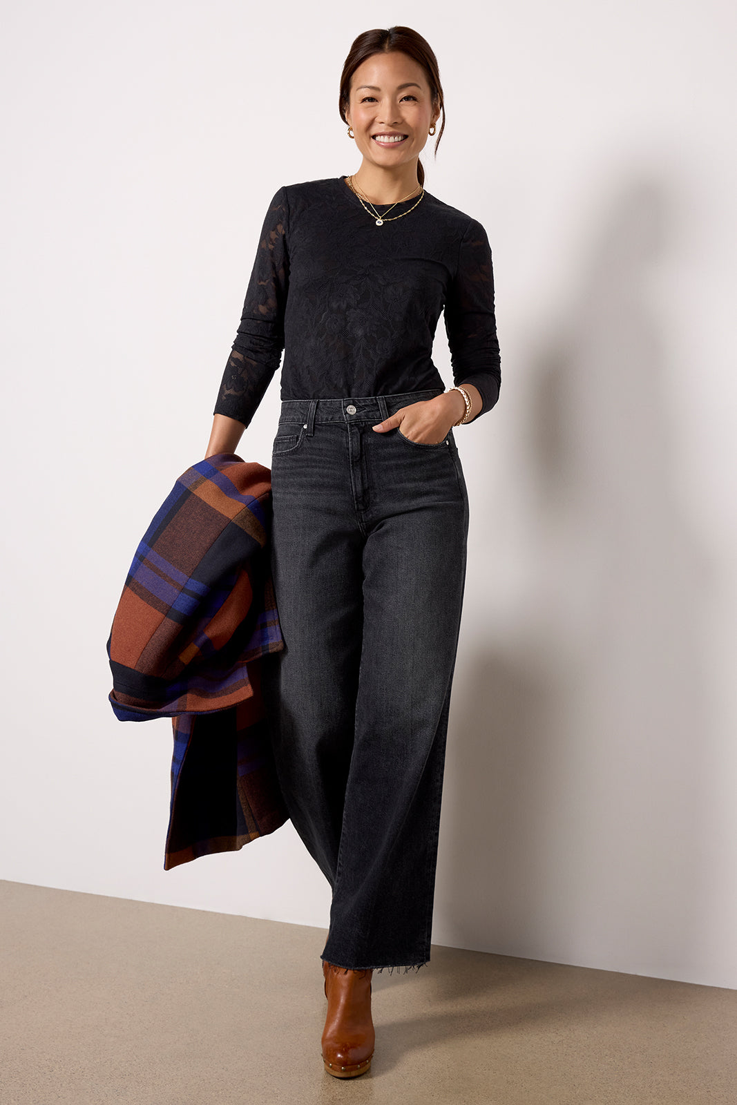 0:00hey gang fashion director picks here0:02it's Heidi and I've got three fabulous0:05ways to get dressed for night out0:08October uniform we're talking about a0:11fabulous cute top and a great pair of0:14jeans we're going to start with the0:16easiest no joke most comfortable look0:19you can put together I've got on this0:22fabulous lace tea from Eve why I love it0:25double line in the front so not sheer0:28but you got a nice sheer sleeve here but0:31it's a layer gang so giving you a little0:33bit of extra warmth as those0:35temperatures dip in the evening0:37unexpected Jean pairing we're going0:40dramatic this is the Citizens of0:42Humanity Aya baggie now we often show0:46this rolled twice I wanted it to be more0:48of a full length so I just cuffed it0:50once so it's just grazing the floor hit0:53of metallic shoes these are from0:56Naturalizer they're the number 27 New0:59Brand from them1:00comfortable and crazy crazy Chic they1:03look like they are 10 times more than1:06the price that they are marked and then1:09for a perfect layer this distressed Moto1:13I say it once I'll say it again if you1:14don't have a moto in your closet this is1:17the one for you so fabulous I love that1:21it's a little bit distressed a little1:22bit aged looks like something you've had1:24in your closet for years and years lace1:29leather1:30bit of metallic1:32drama done second look coming up okay1:36next look about as Fabulous As It Gets1:40showing a little skin mixing a little1:43vegan adding a little animal print here1:46we go Jesse offthe shoulder sweater runs1:50generous meant to be kind of loose easy1:52breezy Channel your inner Jennifer Beal1:56have a flash dance moment in this1:58fabulous sweater pairing it back to the2:01Taylor vegan trouser from pistola why I2:05love this the seaming is so crazy2:08flattering elongates the legs a little2:11bit higher rise so crazy comfortable and2:15then I want to pop of heel black on2:18black but we're mixing texture so it2:20keeps it really interesting and this fun2:22little sling back in a snake notice how2:25low the heel is makes it so easy to pair2:28this and this is a shoe I'm even going2:30to wear to work there you go fun2:34combination we've got one more look2:36coming up another great way to go out2:40last look here we go simple simple cute2:43top great jeans touch sexy little heel2:47fun accessory Arlo burnout velvet top2:51I'm going to come in close so you can2:52see this cool cool pattern feels almost2:57a little bit animal inspired I am2:59wearing a c hammy underneath because it3:01is pretty sheer or just wear a black bra3:03and have some fun Cassie straight leg3:06jeans from pistola fits like a dream and3:09there is nothing sexier than a fabulous3:12pair of perfect fitting straight leg3:15denim I love this wash little bit3:18roughed up gives it a little bit of edge3:20now accessories fabulous Dolce Vita3:23sling back metallic shoe more of a3:27mirror finish Touch of silver kind of3:30feel to it but you can mix your Metals3:32just like I'm doing and then the pie did3:35resistance CLA V bag I love love love3:40this handbag it does come with a long3:41strap so you can wear it as a cross body3:43more casual I'm loving it as a great3:46little clutch there you go three3:49fabulous looks we're channeling great3:51black tops killer Denim and a statement3:54making shoe to pull it all together hope3:57this gave you some great ideas and I4:00will see you soon take care4:04[Music]