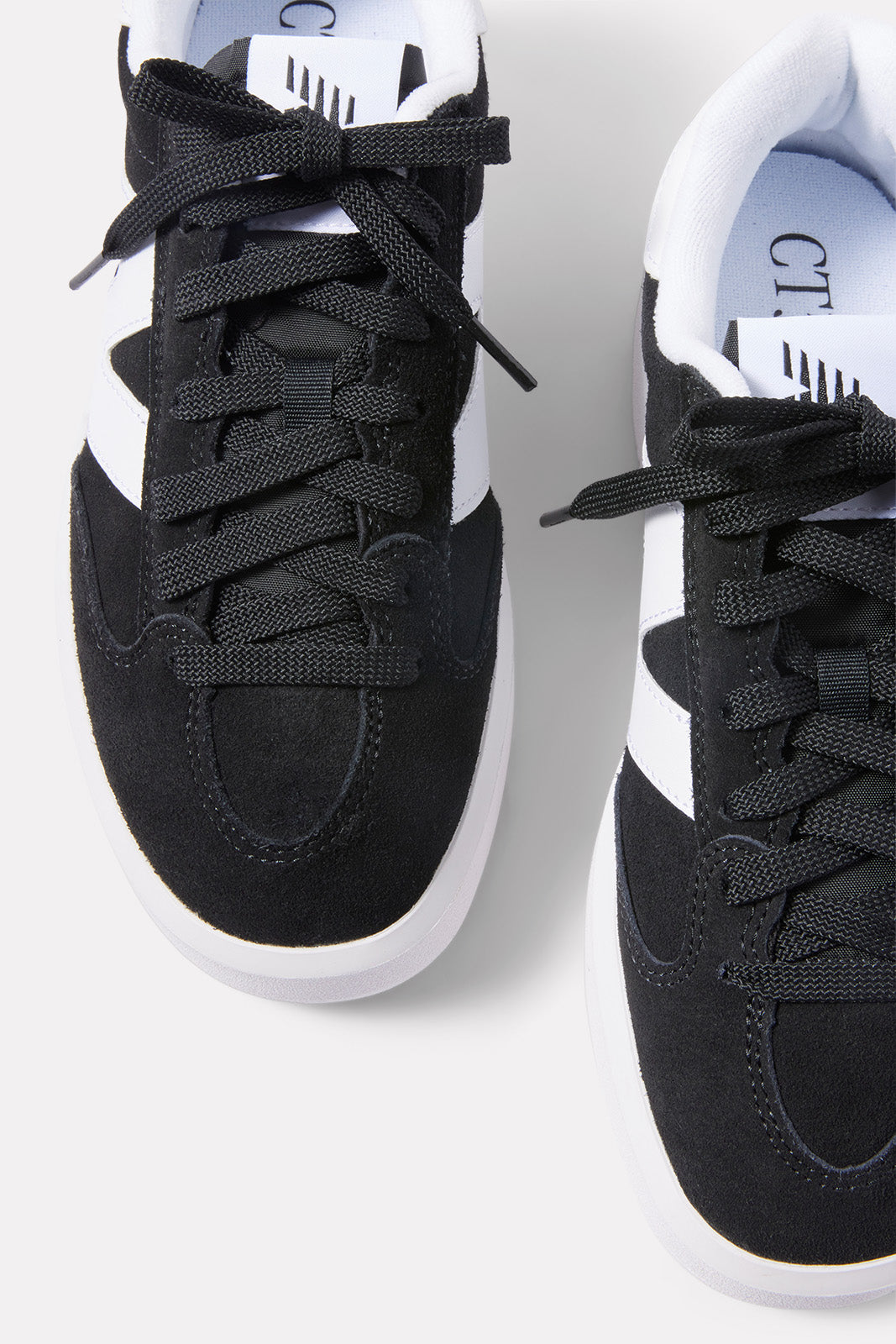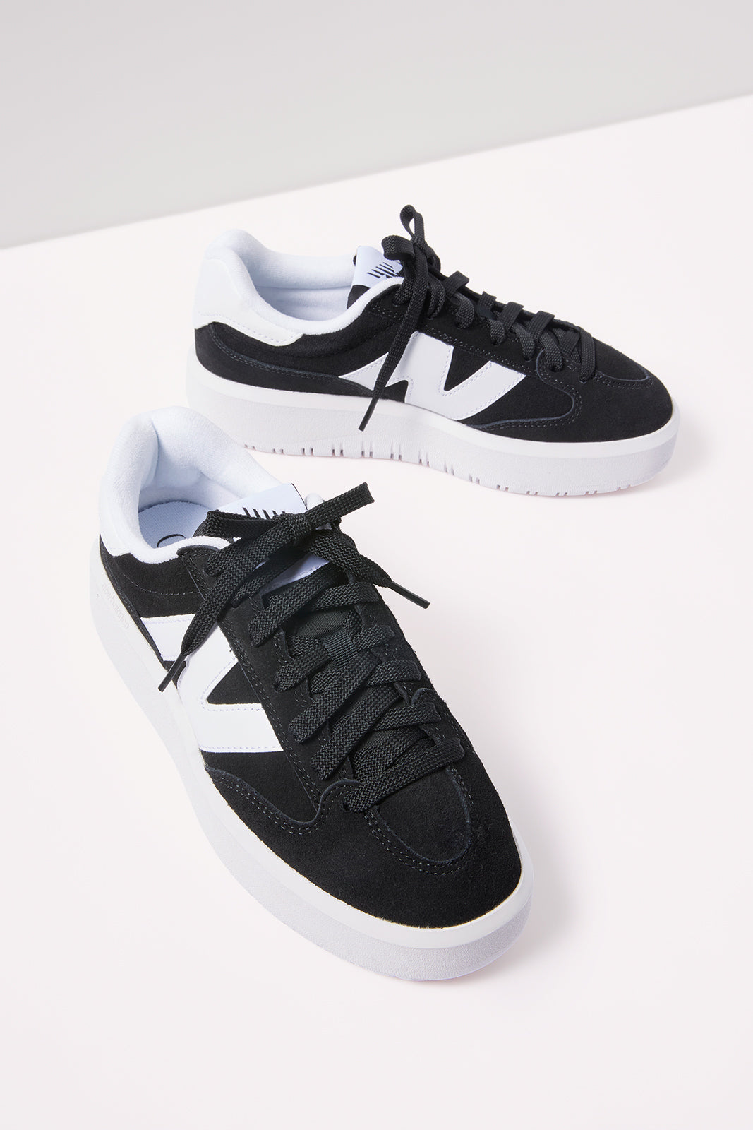 A bold platform sole updates these retro-inspired sneakers by New Balance, featuring a low-top, paneled design in black suede fabric.