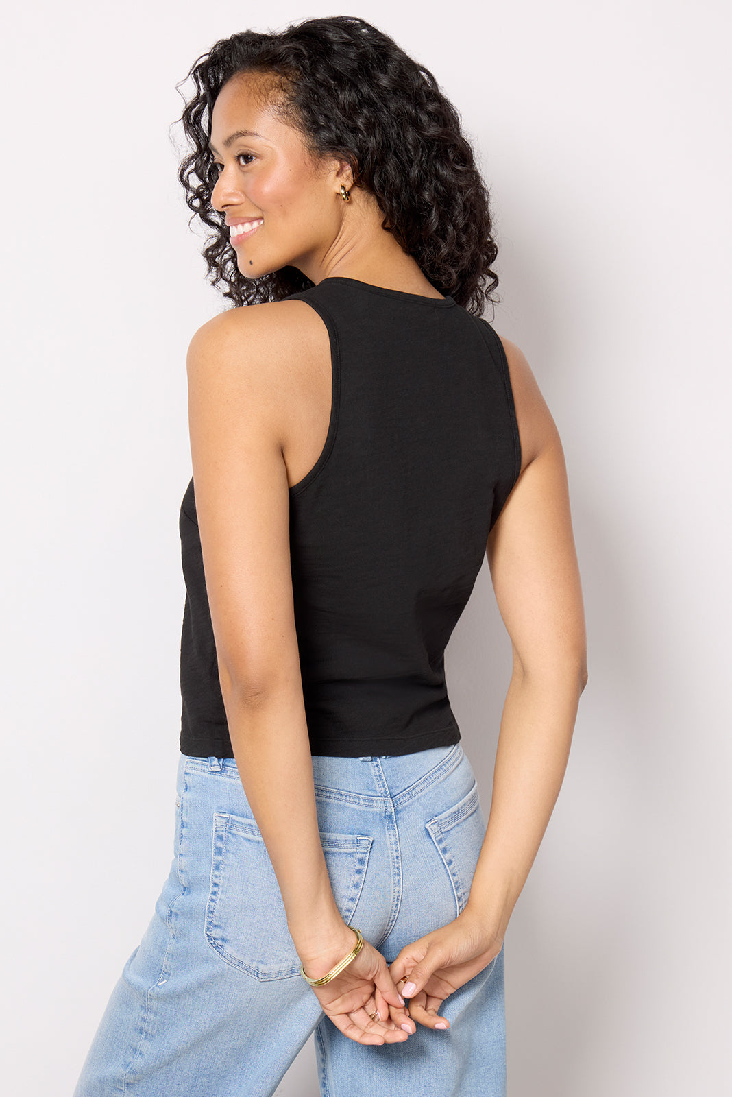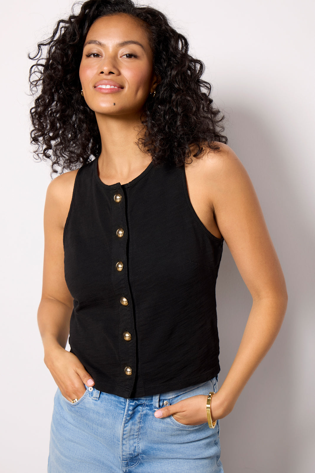 Gold buttons add an elegant touch to the Abbie Tank by Nation LTD, featuring a soft cotton fabric, crew neckline, and a cropped fit.
