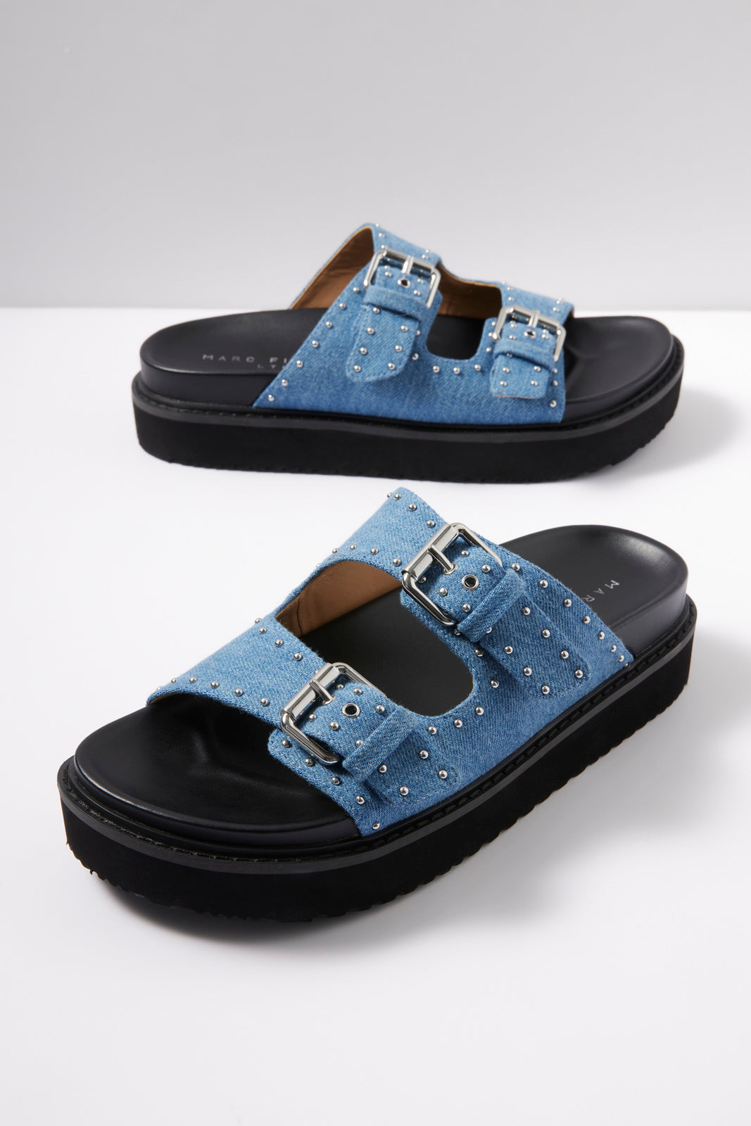 Denim fabric elevates these stylish platform sandals by Marc Fisher LTD, featuring adjustable straps and silver stud details. Slip them on with your favorite warm-weather look.