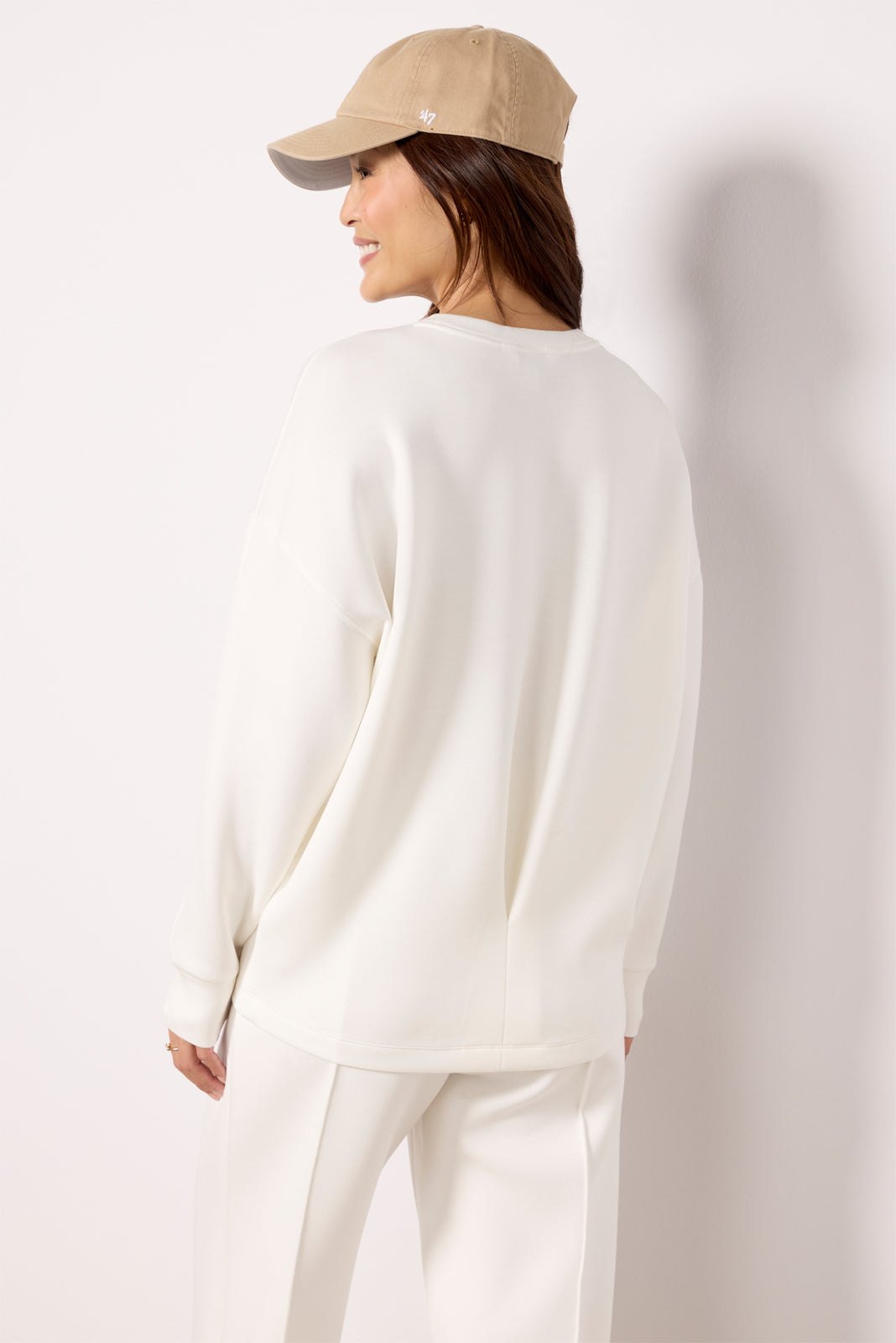 Designed with a longer length, the AirEssentials Crew sweatshirt by Spanx will be your favorite everyday staple. Finished with a pleated back detail and banding at the hem and cuffs, this relaxed pullover is crafted in airy, ultra-soft fabric for throw-on-and-go comfort. Make it a set with the matching Wide Leg Pant.