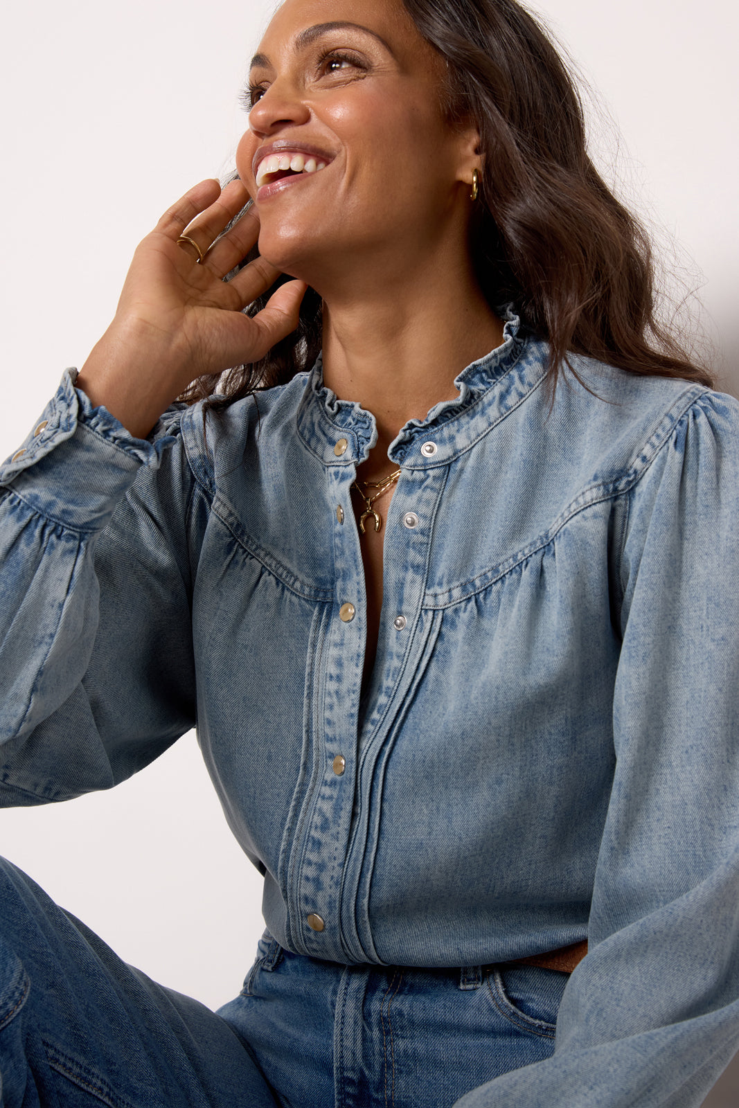 Finished with ruffles at the collar and cuffs, the Alanna Shirt by Rails is crafted in soft lyocell-blend denim with a seamed yoke, front snap closures, and long puff sleeves. Tuck into cargo pants, or pair with jeans for a denim-on-denim look.