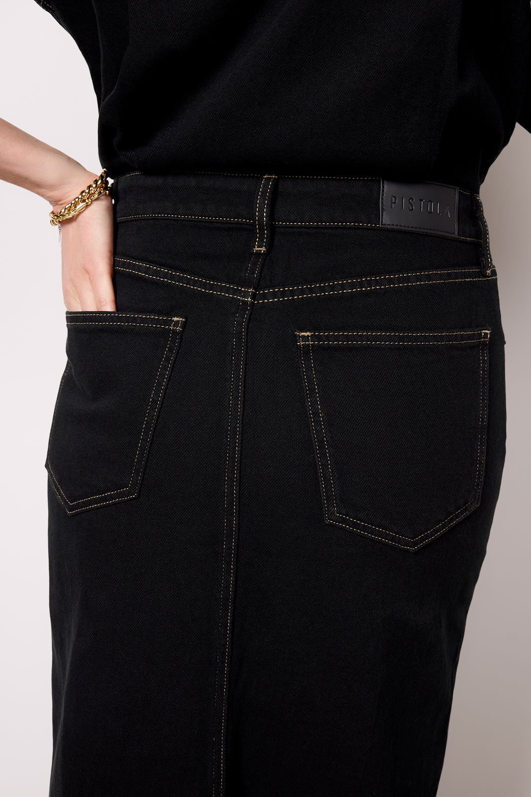 Get the perfect one-and-done denim look with the Amira dress by Pistola. Finished in a black wash with contrast stitching, this denim midi dress is crafted in structured cotton with a snap-front bodice, 5-pocket waist, raw edge hem, and front slit detail. Pair with mules or knee-high boots for an effortlessly stylish look.