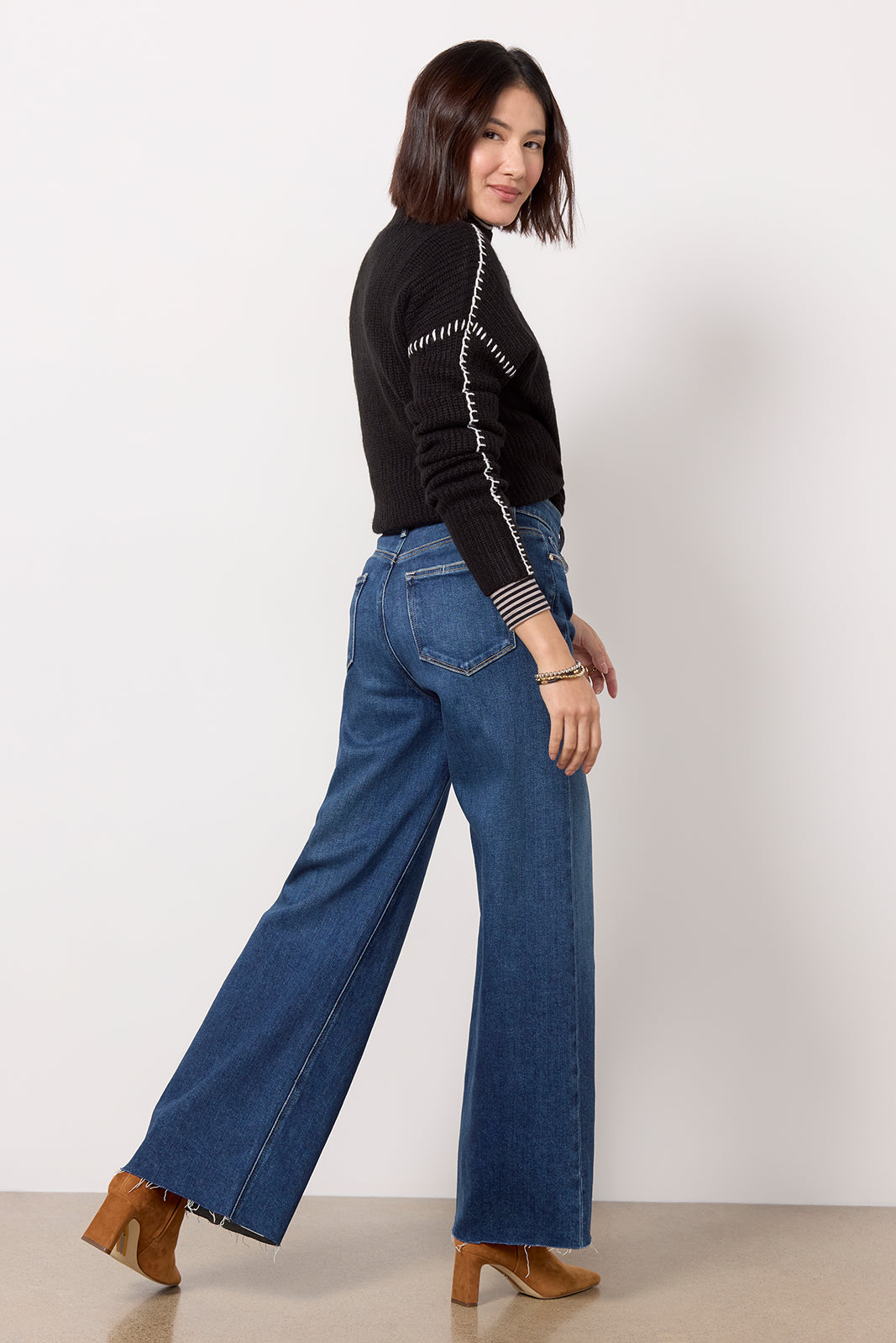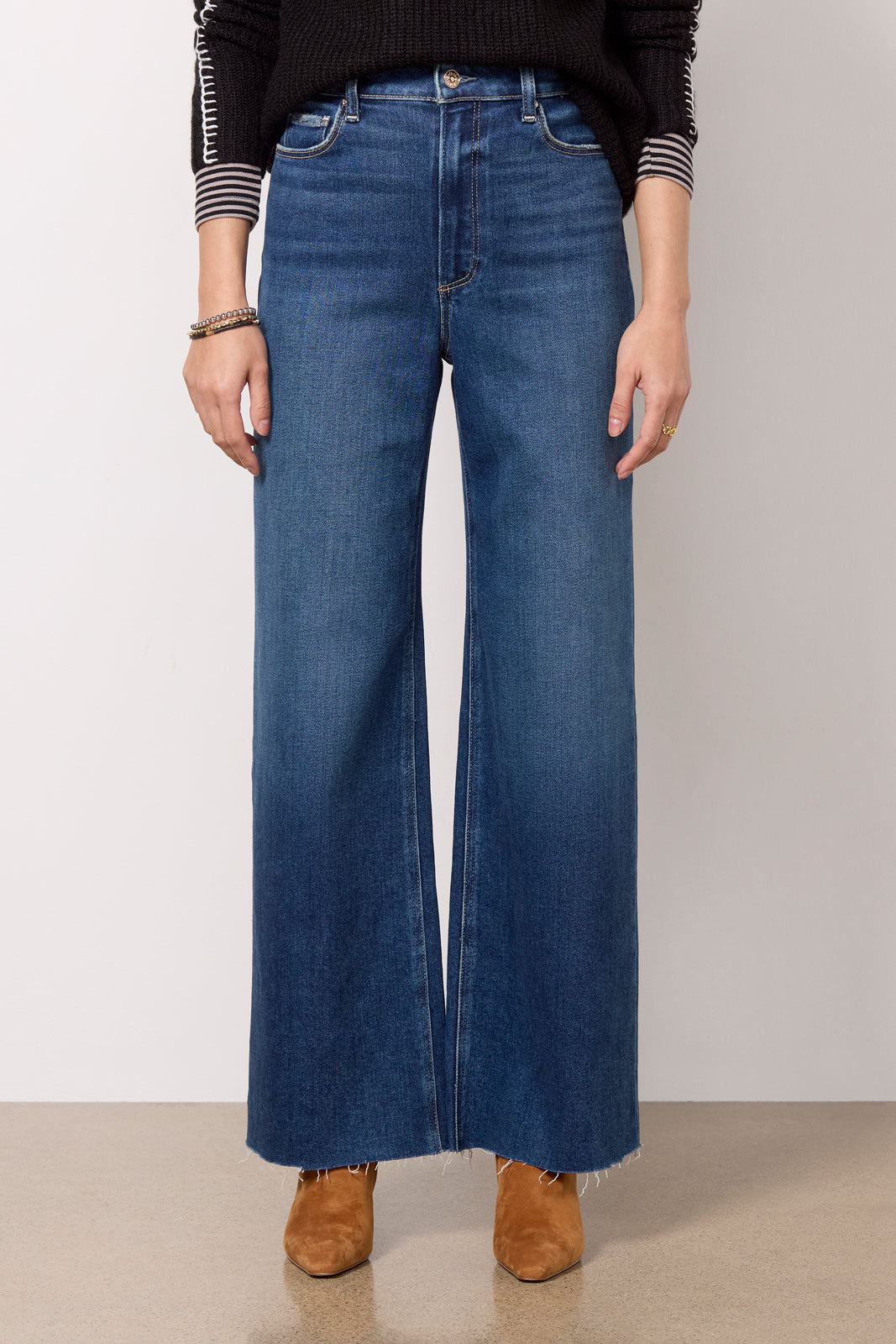 The wide leg jean you’ll be wearing on repeat. Designed with a petite 29" inseam and higher knee and mid-thigh placements, these Paige jeans are crafted in soft stretch denim with a flattering high-rise fit, dark blue wash, and full-length raw hems. Take them from day to night with the switch of a shoe.