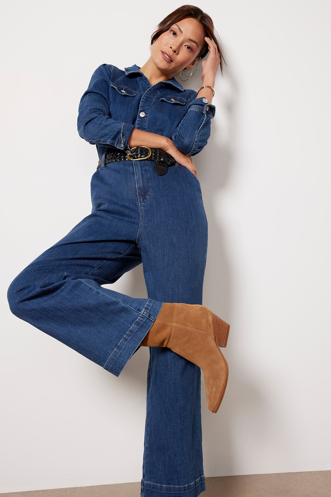 This denim jumpsuit by Paige is the ultimate one-and-done piece. Crafted in soft stretch denim, the Anessa jumpsuit features a wide leg silhouette with a front button closure, flattering self-tie belt, and long sleeves with puff shoulders. Pair with clogs, or add booties and a leather belt.