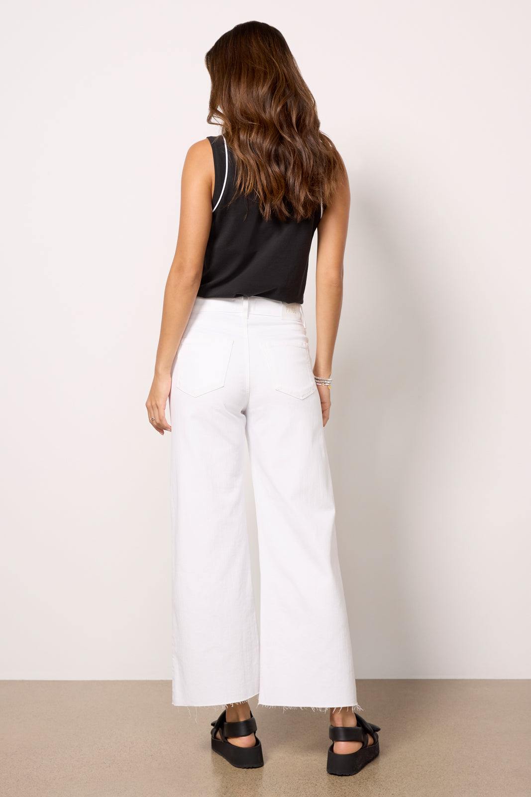 The wide-leg jean you’ll be wearing on repeat. Finished with a full-length inseam, these Paige jeans are crafted in soft stretch denim with a flattering high-rise fit, crisp white wash, and raw hems.