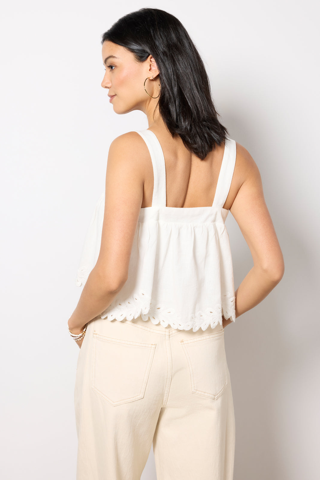 Add a feminine touch to your wardrobe with the Annecy Tank from Z Supply, featuring delicate cutwork embroidery, adjustable button straps, and a built-in jersey bra.