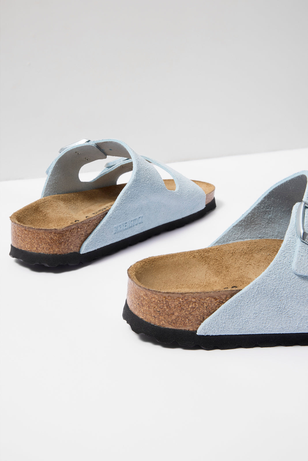 Top off your warm-weather footwear collection with the iconic Arizona sandal by Birkenstock, featuring a slip-on design, comfortable cork footbed, and blue suede straps with adjustable buckles.
