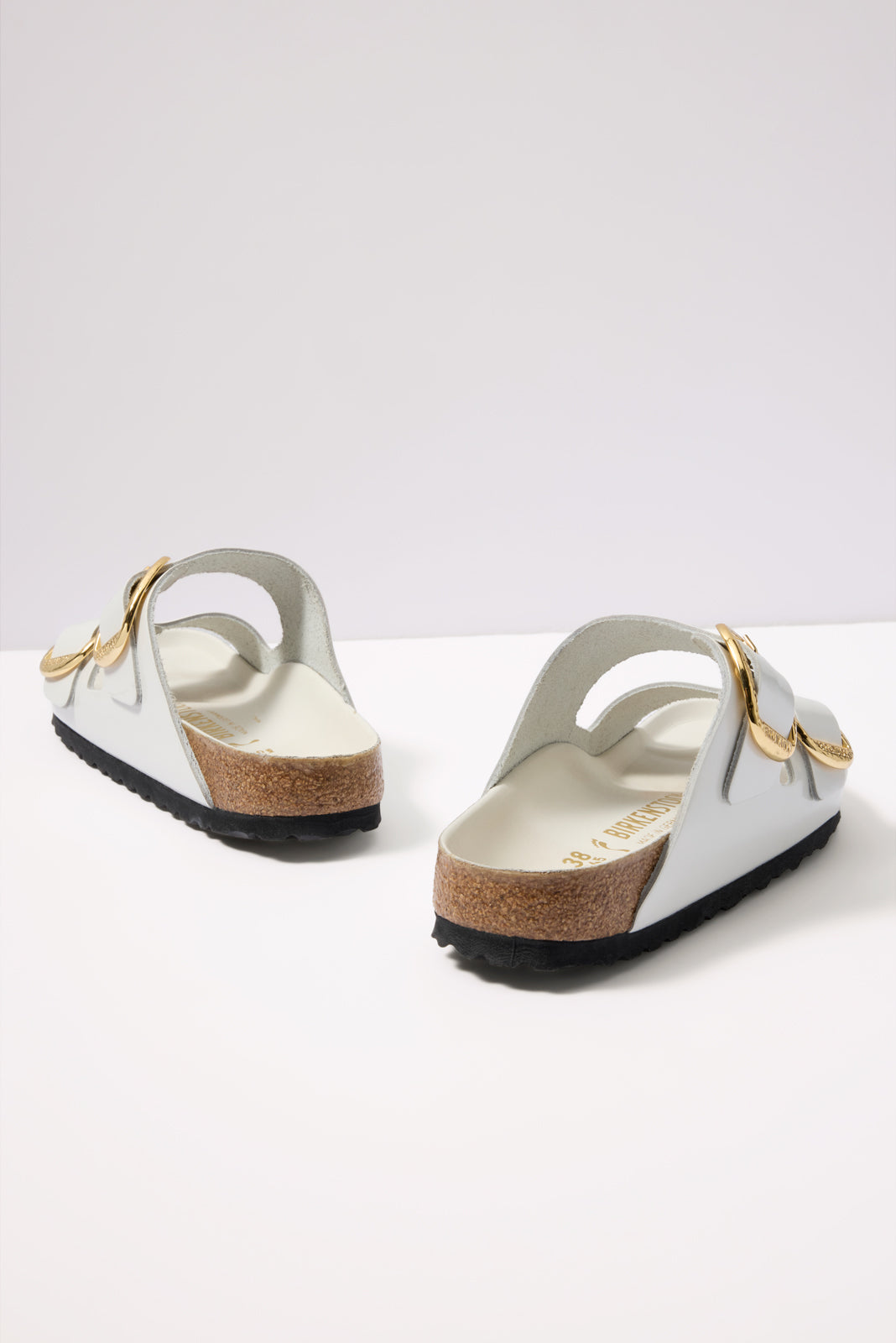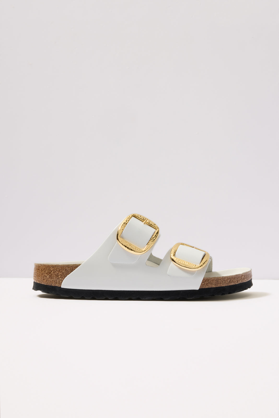 Hammered gold-tone buckles update these iconic Arizona sandals by Birkenstock, featuring white leather straps in a shiny patent finish.