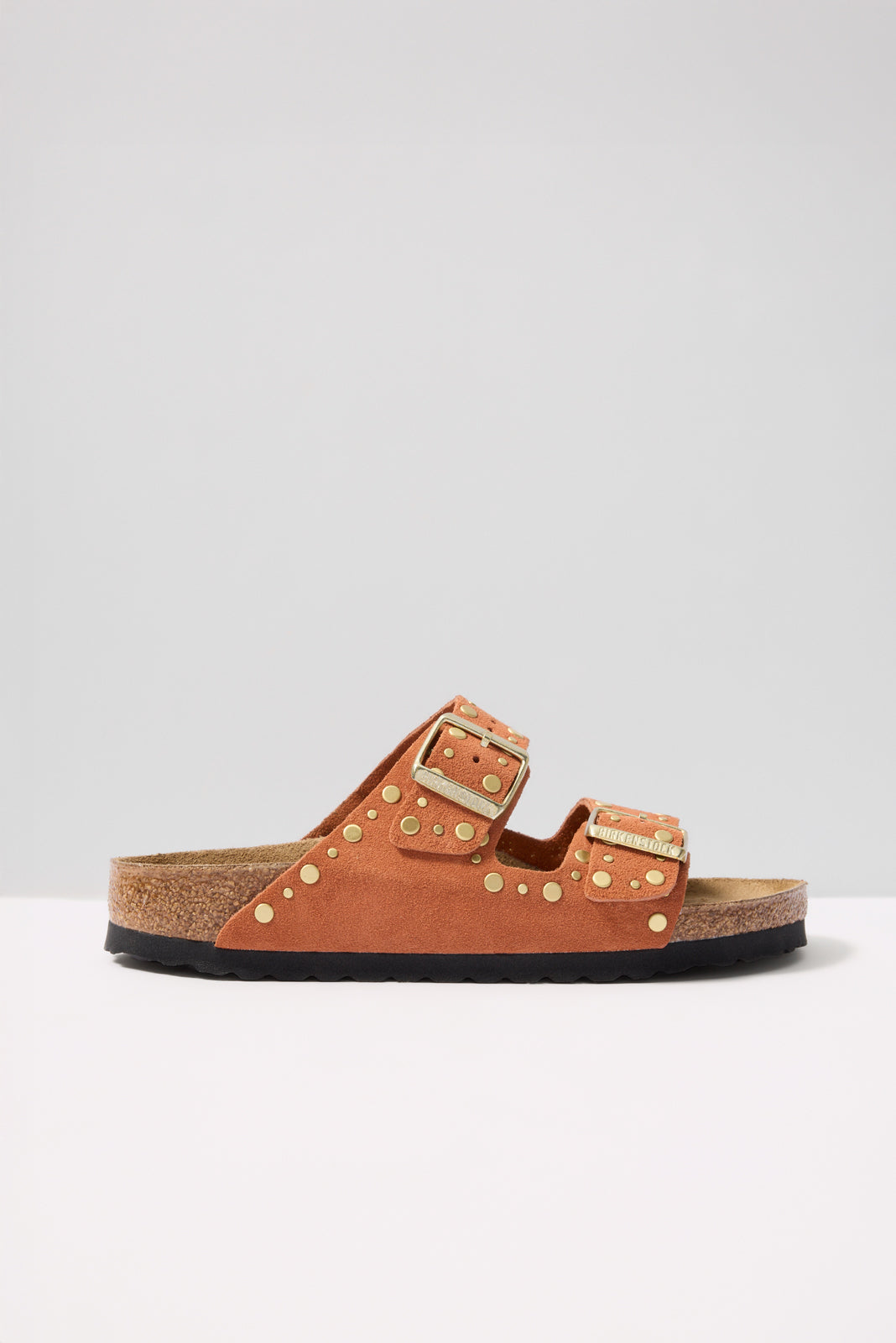 Gold rivet details add a chic touch to the iconic Arizona sandal by Birkenstock, featuring a comfy cork footbed and suede straps with adjustable buckles.