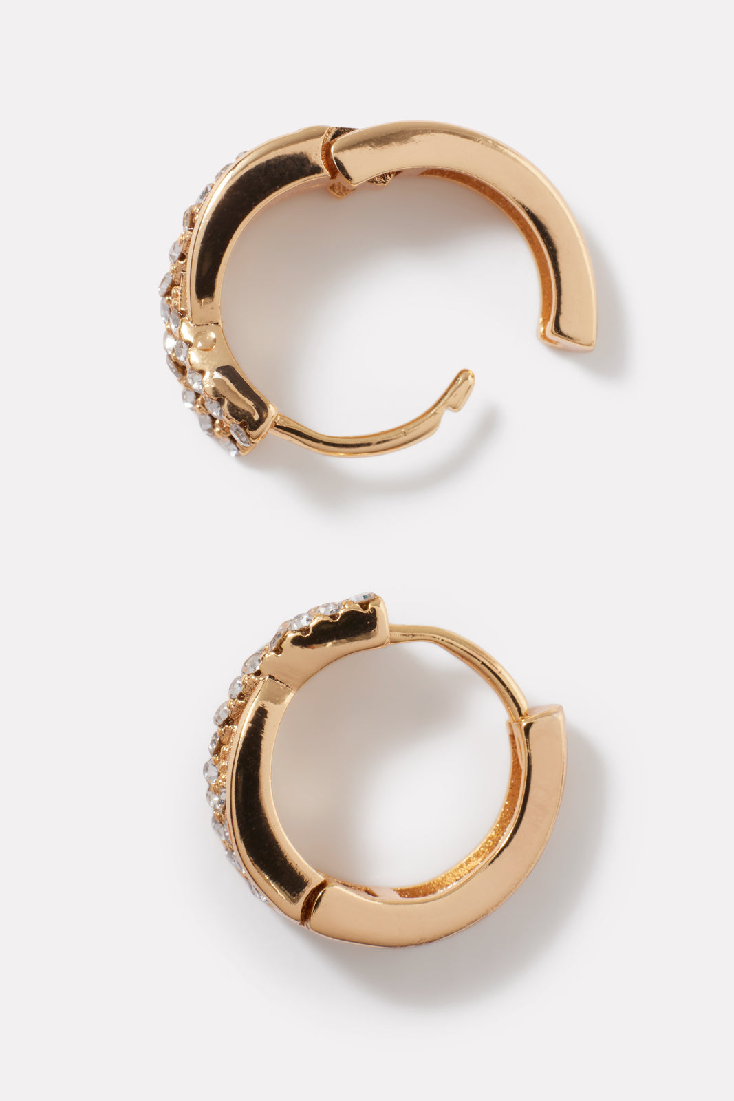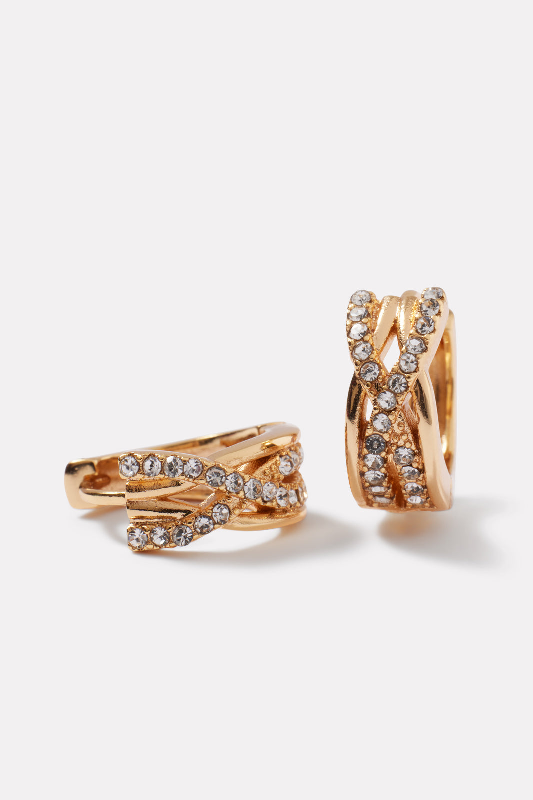 Sparkling stones and a crossover design define these chic huggie hoop earrings, featuring a hinge closure and hypoallergenic posts. Pair them with any everyday or occasion look for the perfect hint of shine.