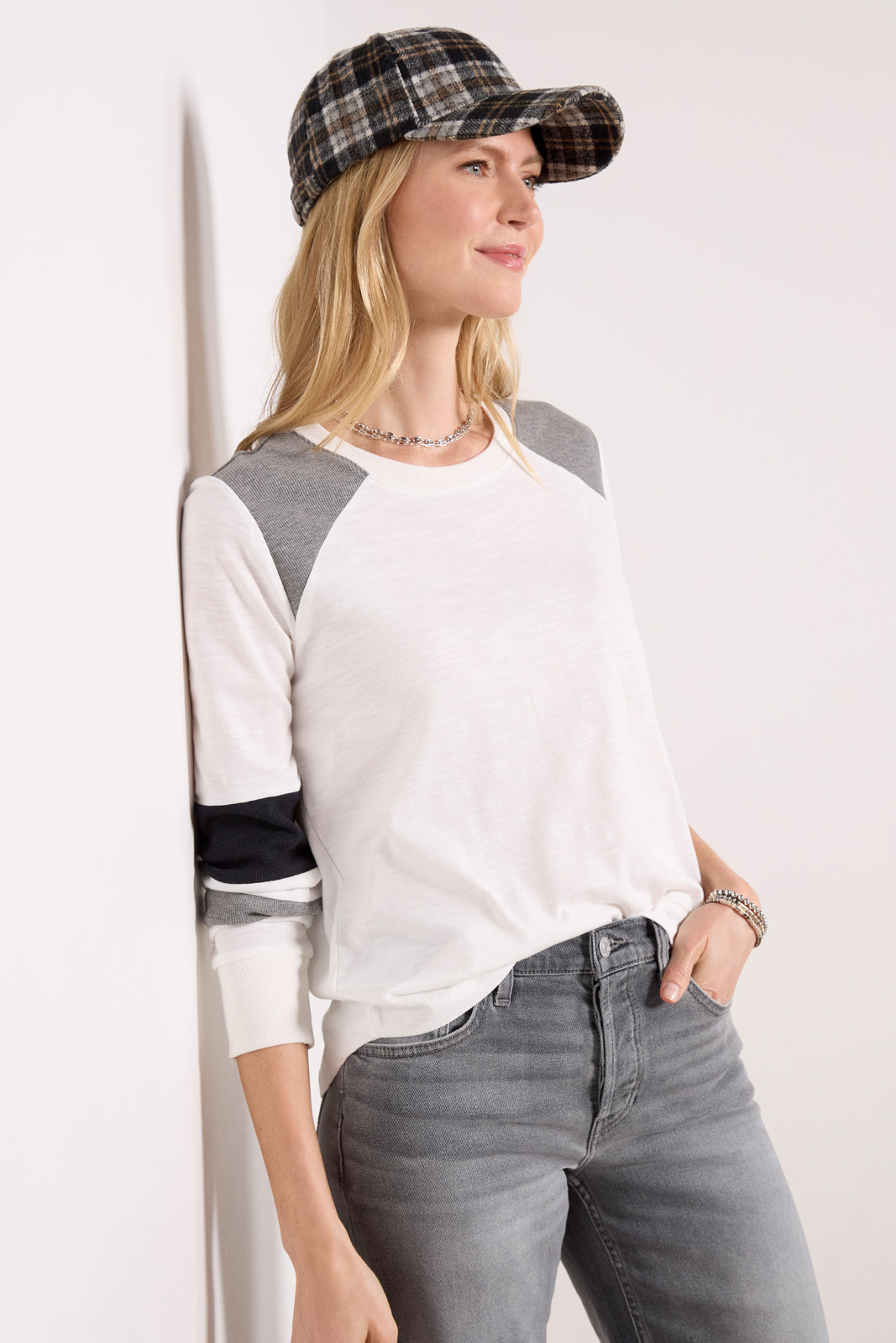 A colorblocked shoulder detail adds a stylish touch to this long sleeve top by EVEREVE. This versatile tee is crafted in soft slub knit fabric with a crew neckline and curved hem. Add cargo pants and loafers for a chic, fall-forward look.