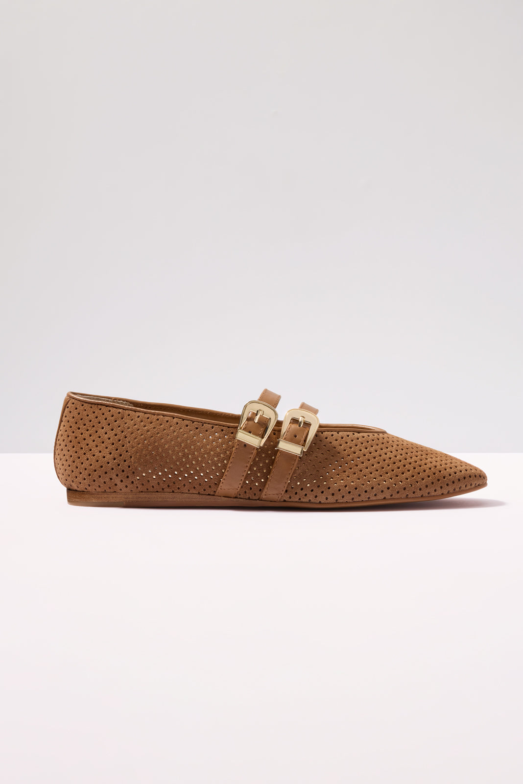 A chic pick for work-to-weekend wear, the Baylee Mary Jane flat by Dolce Vita is crafted in perforated suede with a round toe and bold double buckle design.