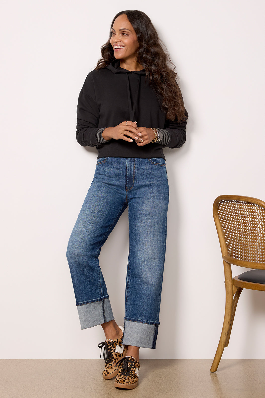 Designed with a seamed corset hem, this stylish EVEREVE sweatshirt features a cropped silhouette with an adjustable drawstring hood and long sleeves. Add it to your fall rotation with jeans or cargo pants.