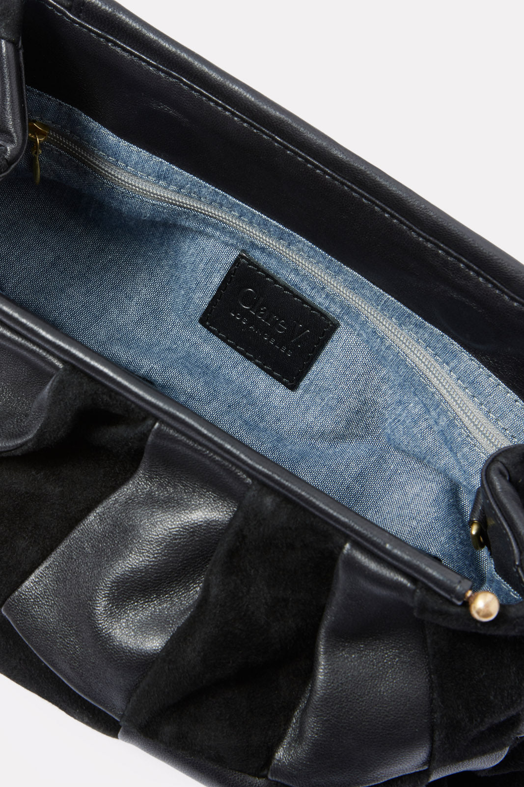 A patchwork design of leather and suede defines this chic Clare V clutch, featuring a magnetic closure and chambray-lined interior with a zipper pocket. Carry as a clutch, or add a strap to wear as a crossbody.