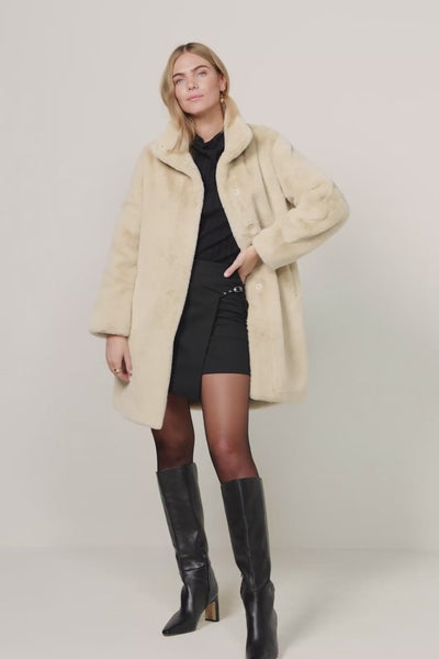 The perfect luxe layer, this chic faux fur coat by APPARIS features a plush longline silhouette with a cozy stand collar, side pockets, and front snap closures.
