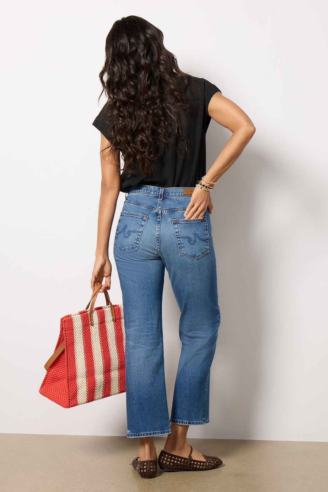 Crafted in soft stretch denim, the Brinley Crop from AG features a mid-rise waist, ankle-length inseam, a clean blue wash, and a straight-leg silhouette.