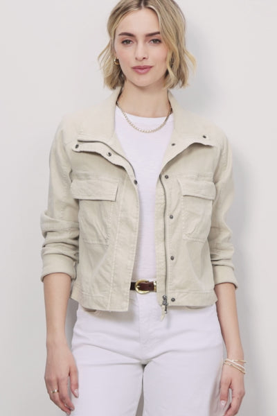 Chic with a utility-inspired edge, this EVEREVE jacket features a slightly cropped silhouette with a front zip and snap closure, chest pockets, and seamed raglan sleeves. The linen-blend fabric makes it the perfect lightweight layer.