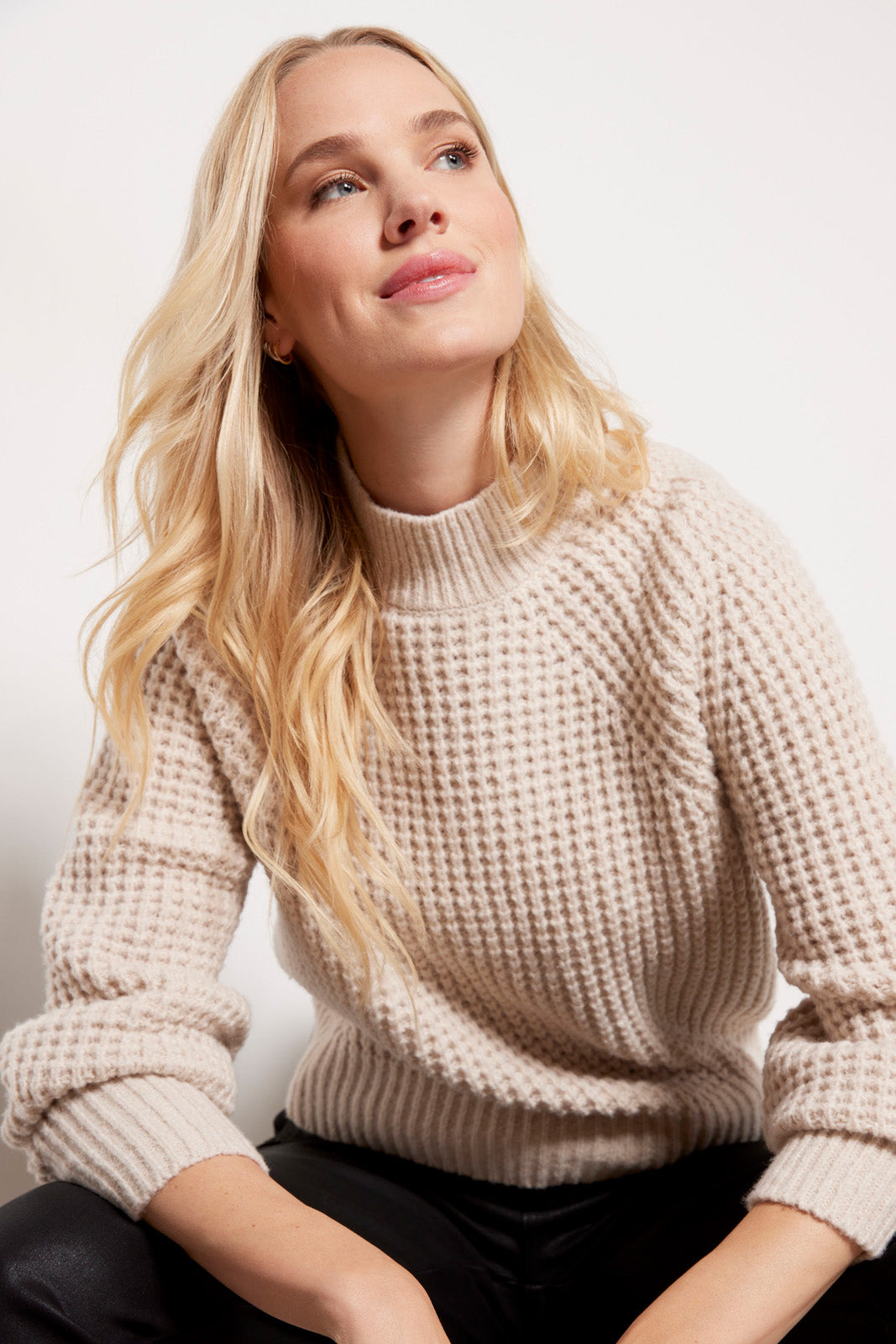 Perfect for your sweater-weather rotation, this EVEREVE pullover features a mockneck silhouette with raglan sleeves, ribbed trim, and a waffle knit texture for extra coziness. Dress it up or down all season long with jeans, leggings, or vegan leather pants.