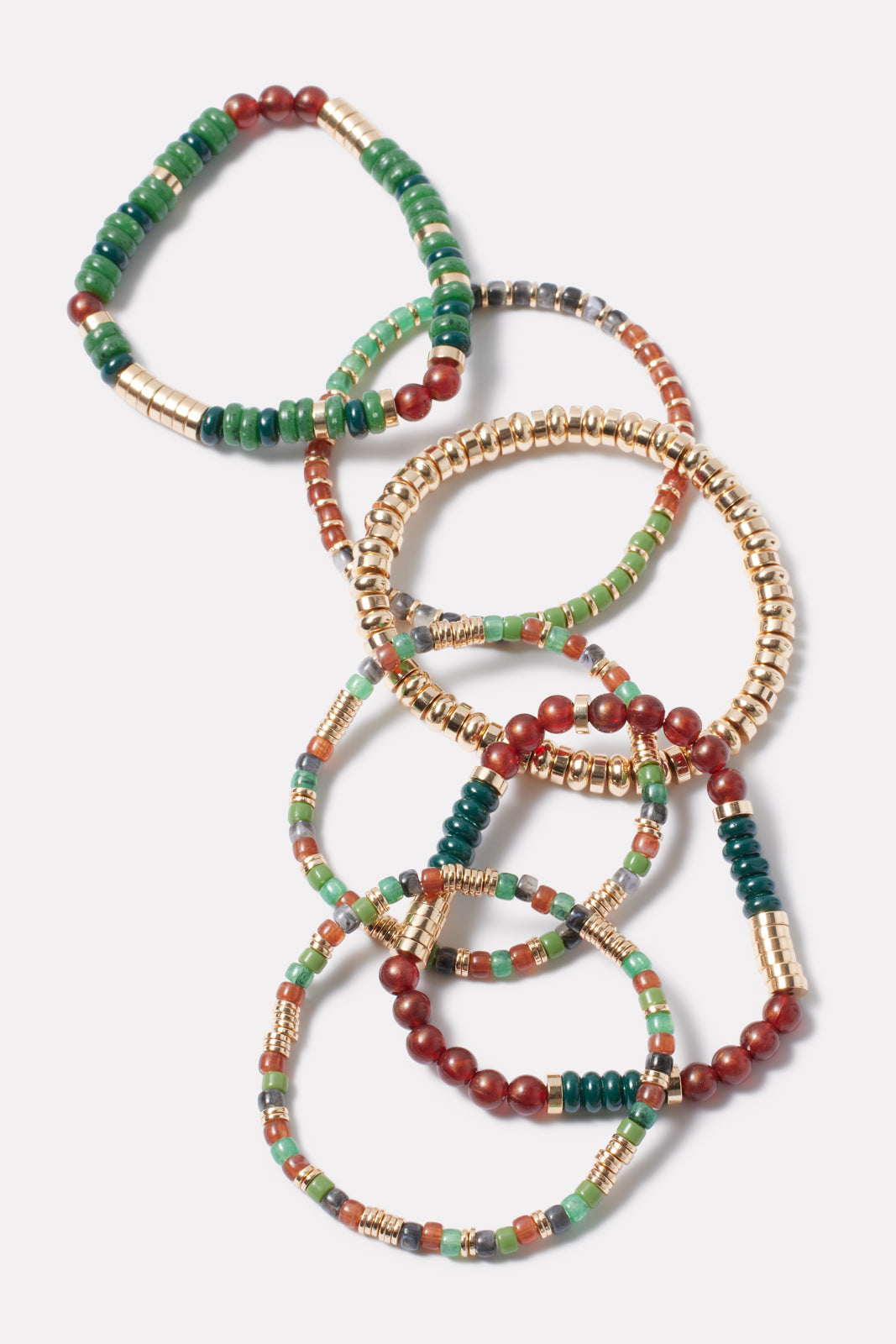 Shades of green, red, and gold come together in this gorgeous beaded bracelet set, perfect for wearing separately or stacked.