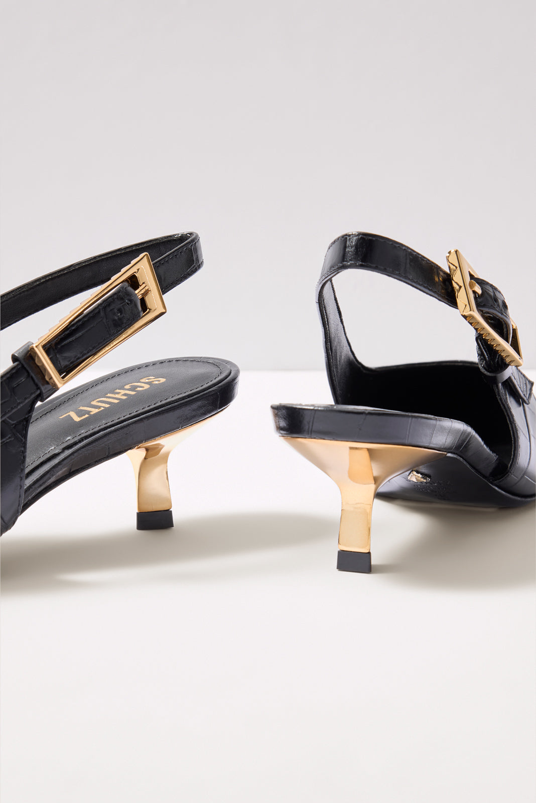 Look chic from office to evening in these slingback pumps by Schutz, crafted in croc-embossed leather with a pointed toe, adjustable buckle, and gold kitten heel.