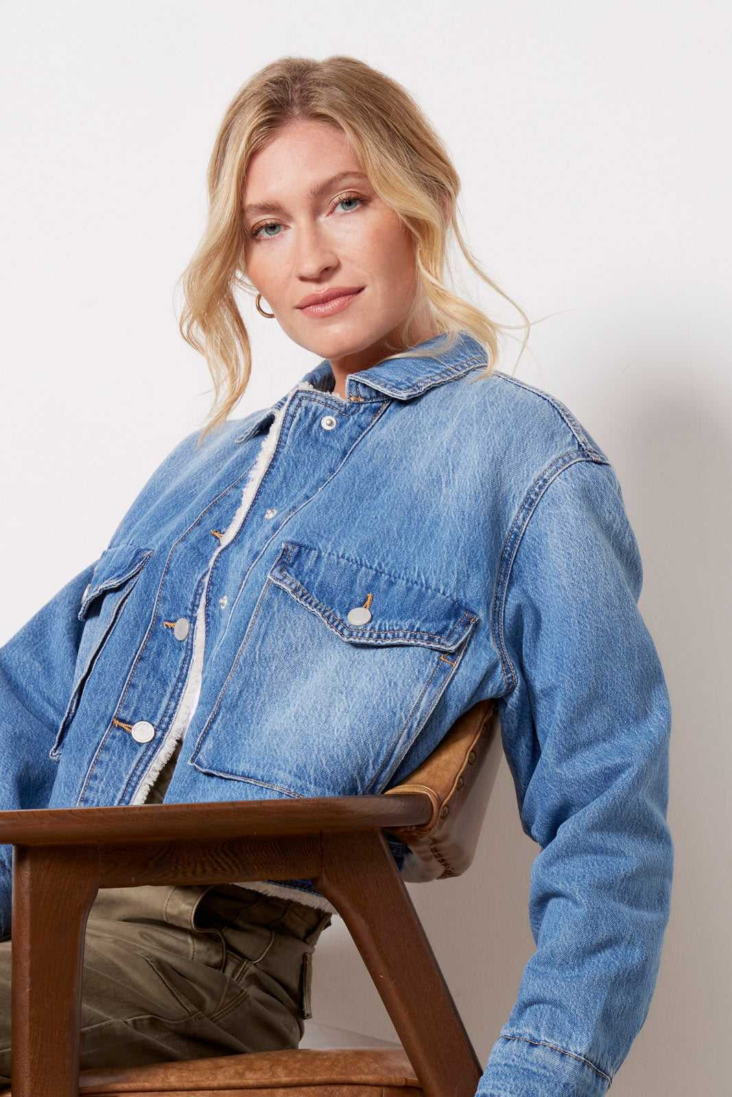 A cozy take on a classic layer, this denim jacket by BlankNYC is lined with soft faux fur and features a cropped length, front snap closure, and oversized chest pockets.