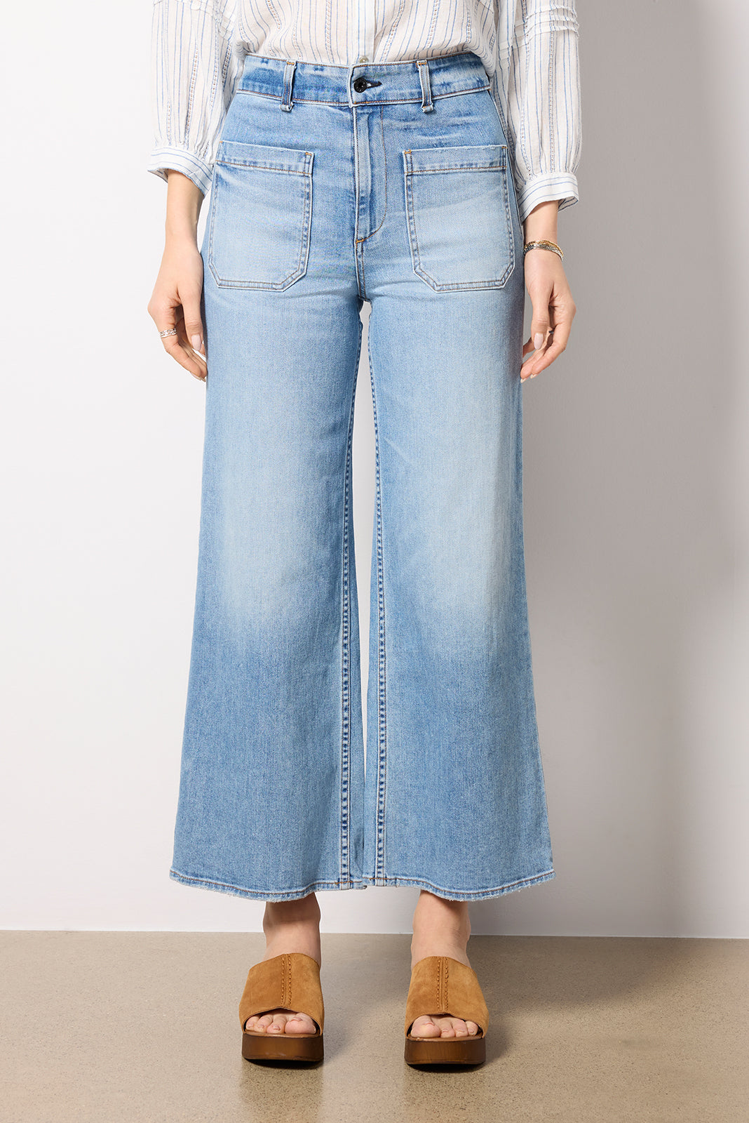 Finished in soft stretch denim, this modern sailor jean by ASKK NY features a high-rise silhouette with a relaxed wide leg, ankle-length hems, and patch pockets at the front and back.