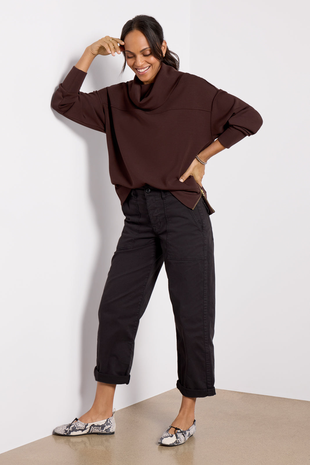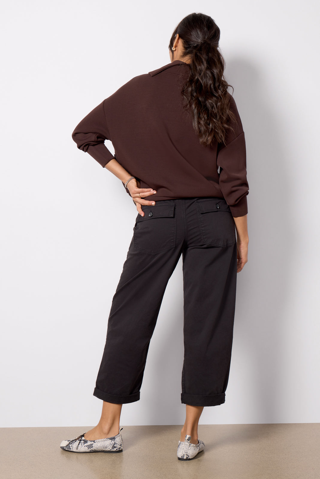 Utility-style pockets detail the Cruiser Chino pants by Sanctuary, featuring a slight barrel leg shape with rolled hems—perfect for dressing up or down.