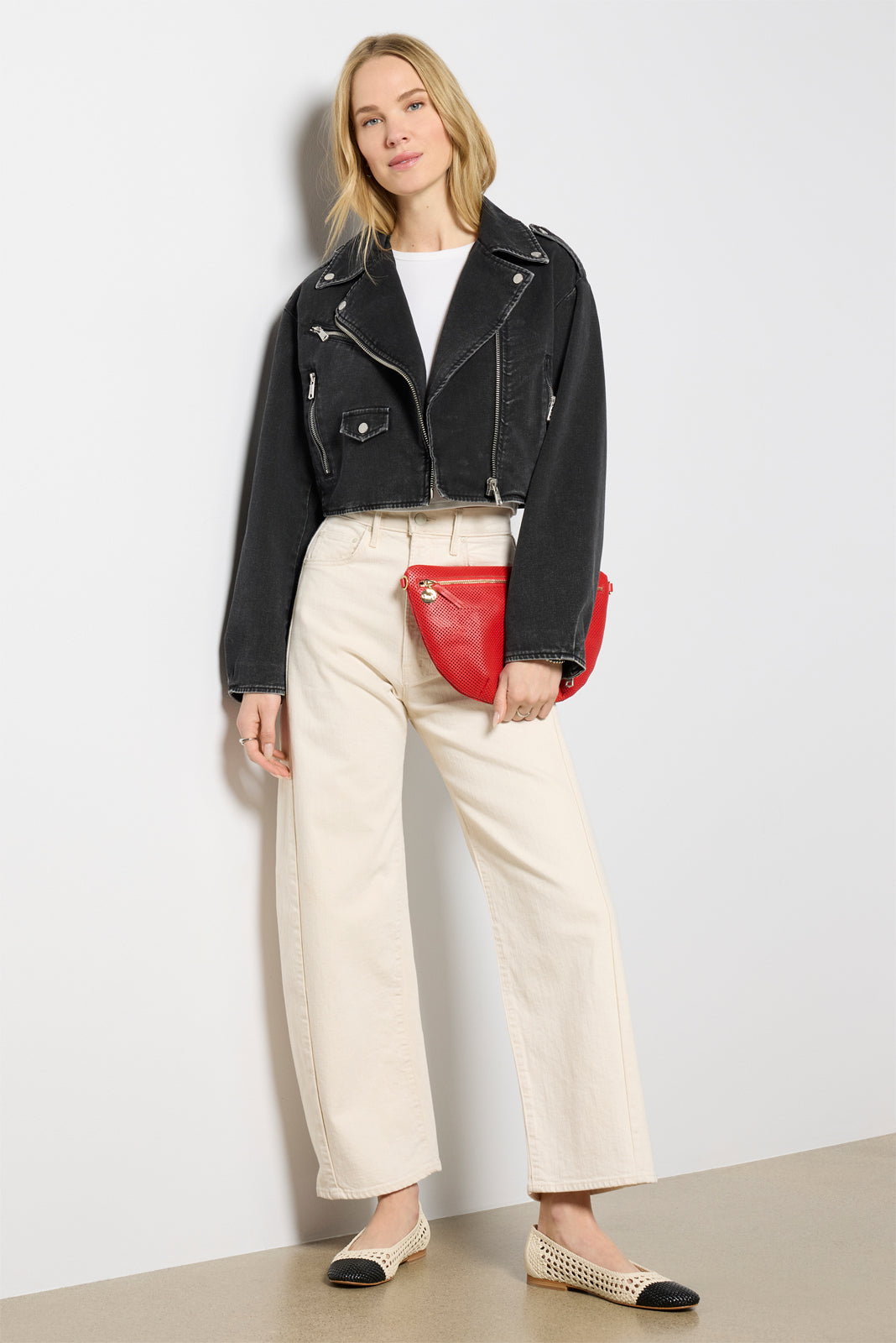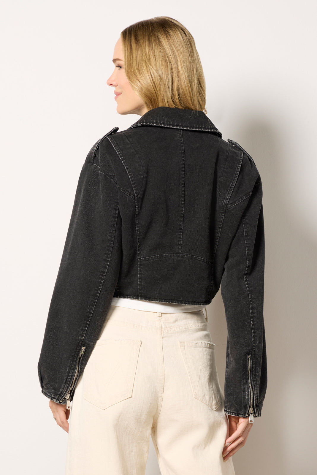 Layer your next night-out look with this chic denim moto jacket by Avec Les Filles. Crafted from cotton denim in a versatile black wash, this biker-style jacket features a cropped length, asymmetrical front zipper closure, and zippers at the pockets and cuffs.