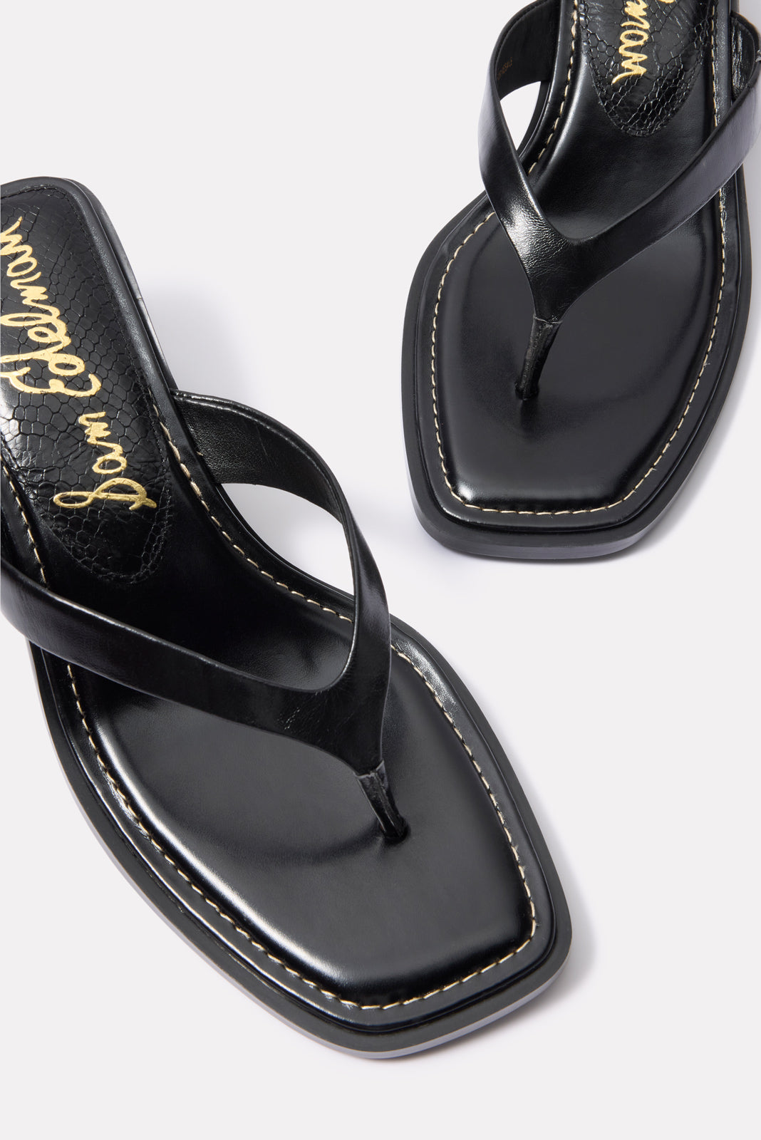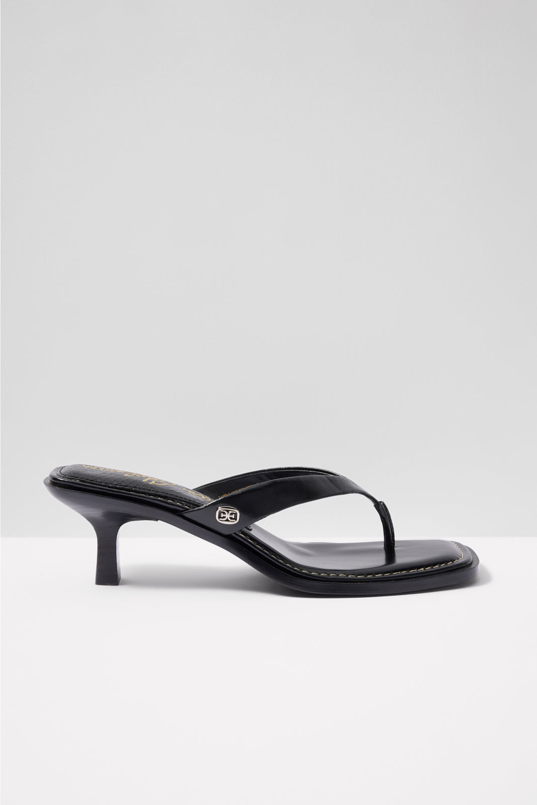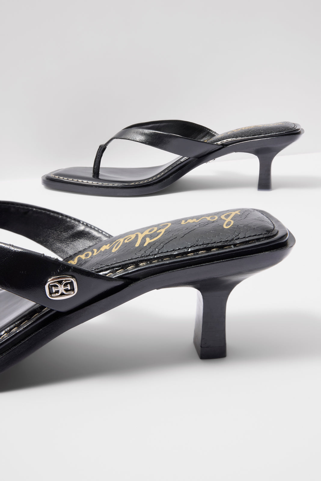 A chic staple for any occasion, the Dollie kitten heel sandal by Sam Edelman is made from soft black leather with a thong-style strap and square toe.
