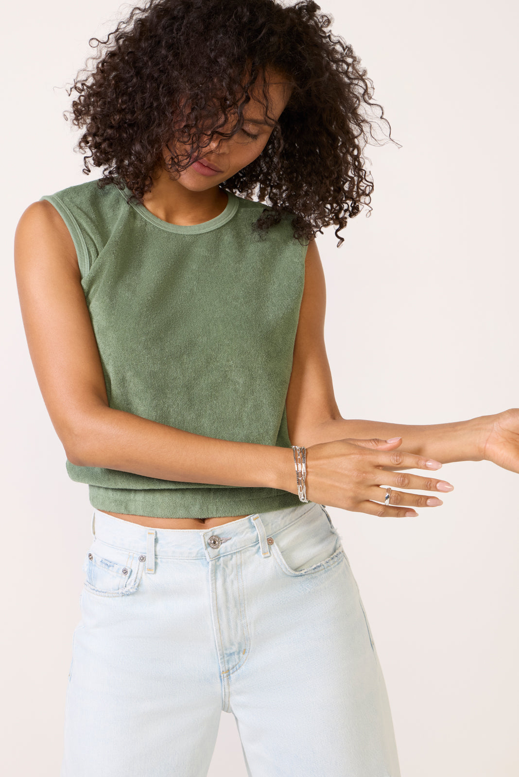 Finished in soft loop terry fabric, this summer-ready tank top by perfectwhitetee features a sleeveless silhouette with a crew neckline, cropped length, and fitted hem.