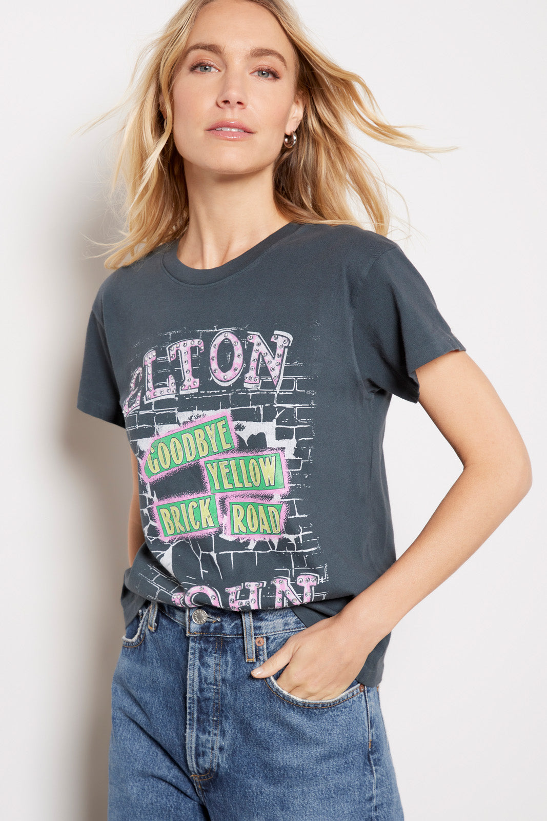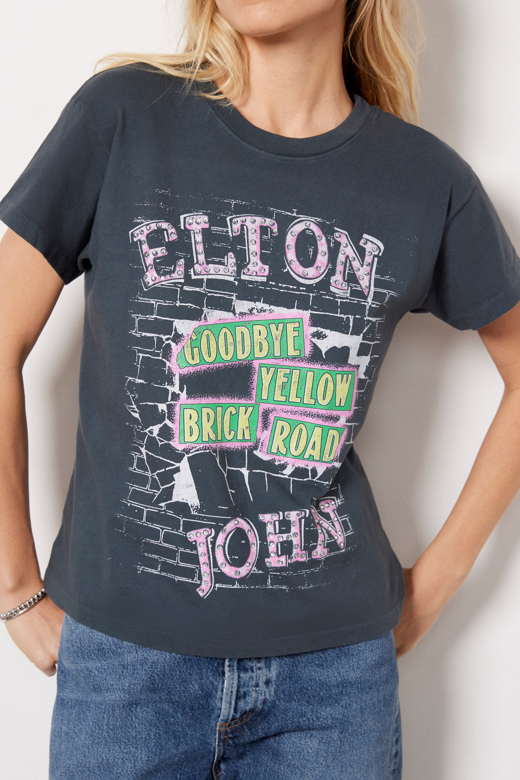 Show your love for Elton John's iconic album with this graphic tee by Daydreamer. Crafted in vintage-feel cotton fabric, this relaxed tee features a crew neckline, short sleeves, and a "Goodbye Yellow Brick Road" graphic accented with rhinestonesjust add jeans and a moto jacket.