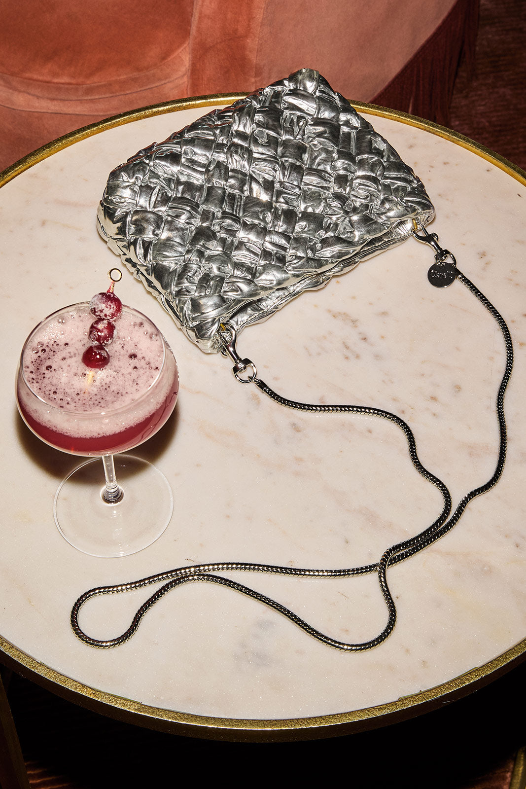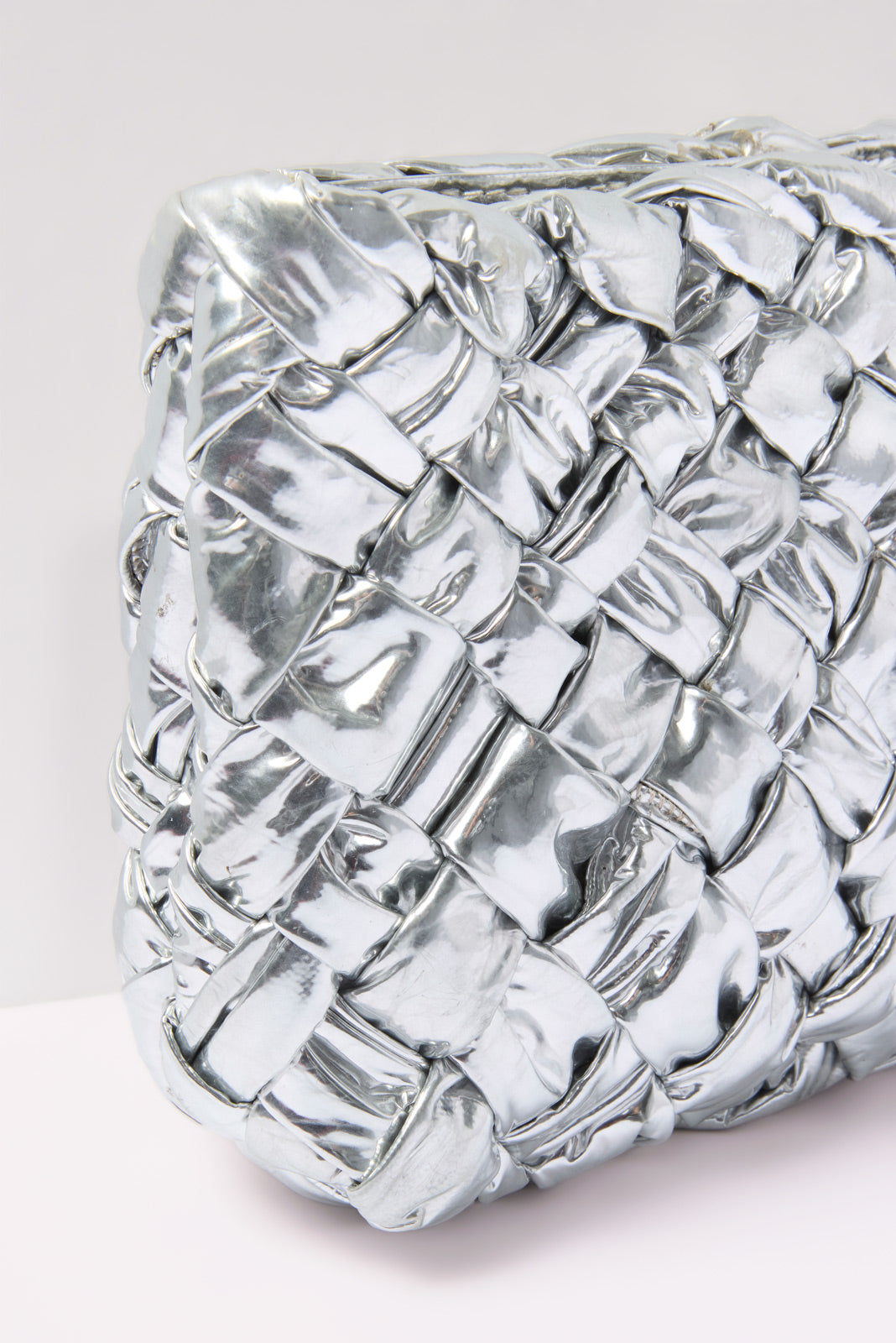 Make a chic statement with this silver metallic bag by Clare V. Finished in puffy woven leather, the Estelle bag features a snap closure, lined interior, and removable snake chain strap to wear as a crossbody or carry as a clutch.