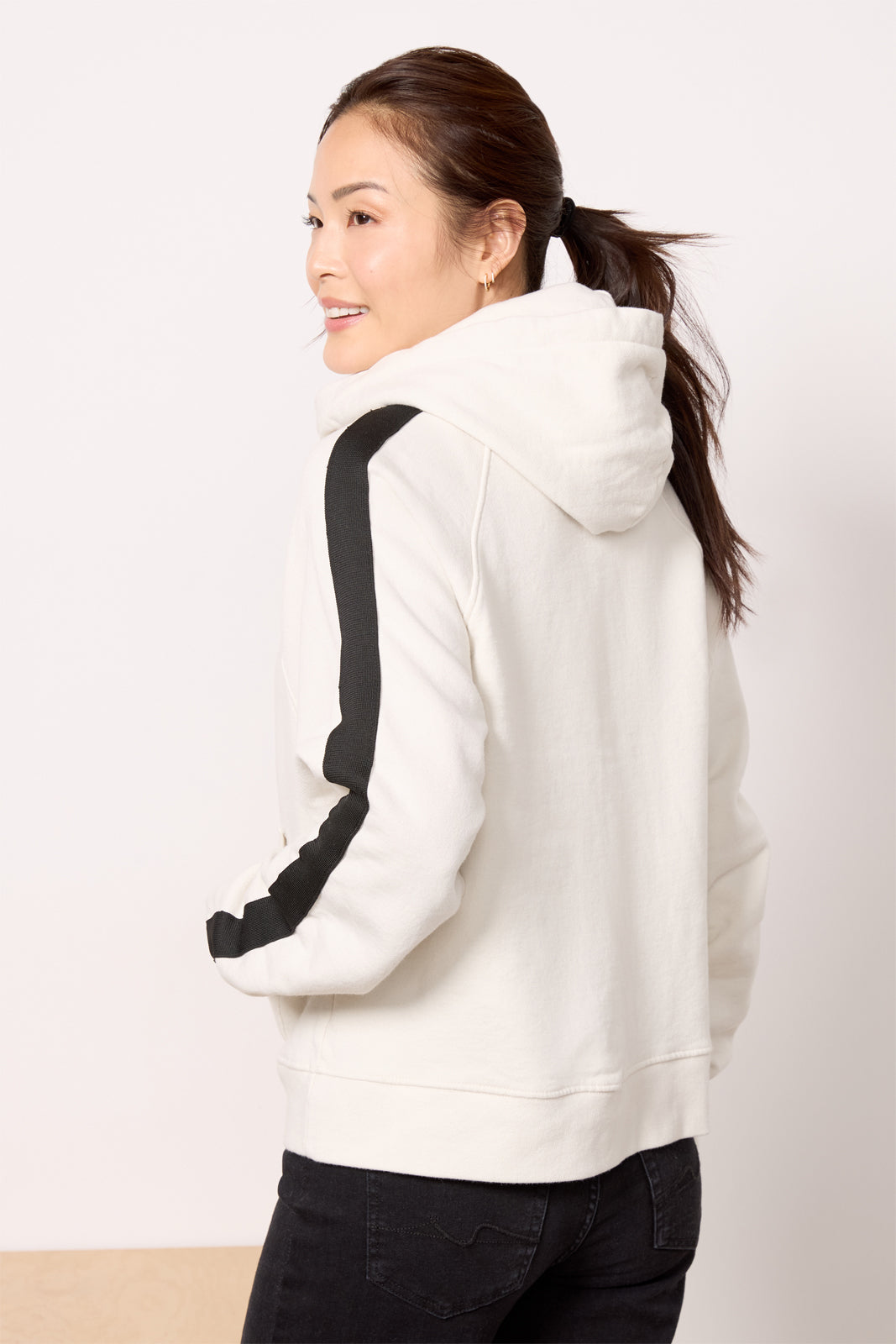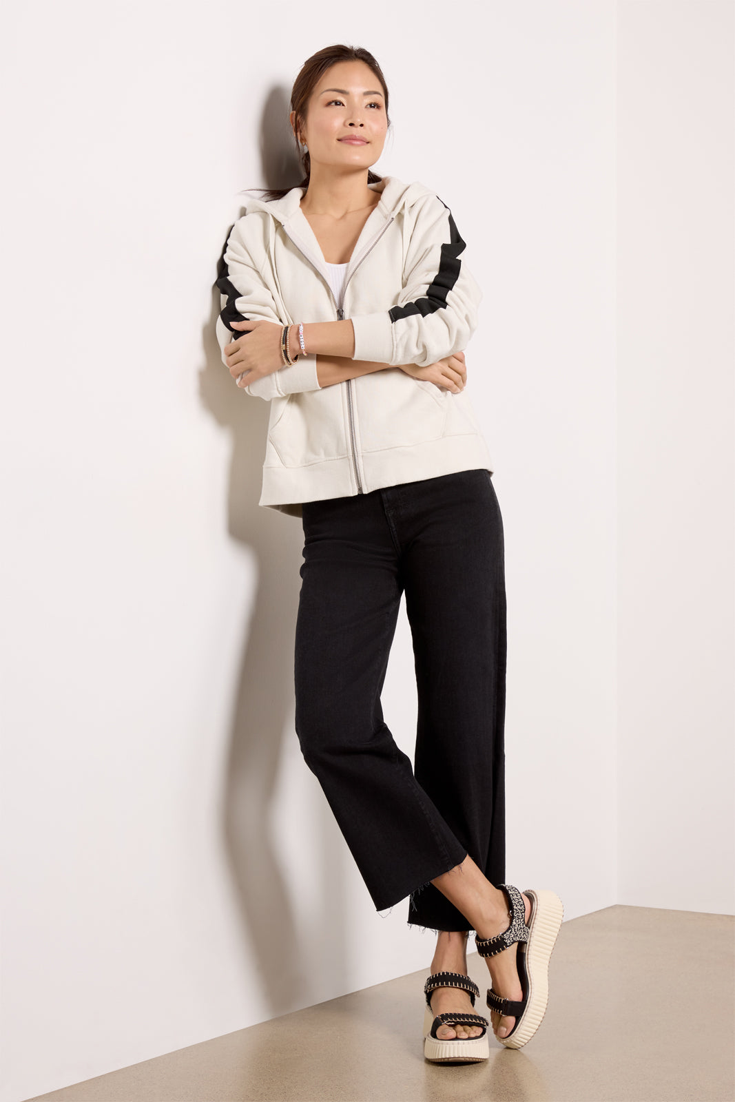 Top off your weekend wardrobe with this zip-up sweatshirt by Spiritual Gangster, featuring an adjustable drawstring hood, front pockets, and raglan sleeves with contrasting stripes. Layer with a tank and jeans, or pair with the matching Joy Stripe Pant for a comfy-chic set.