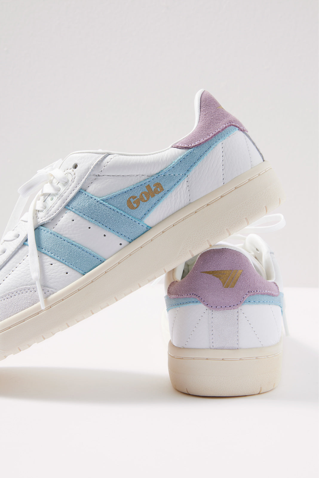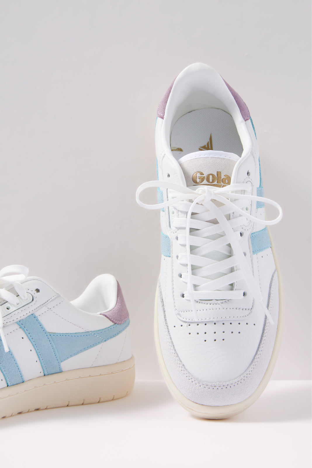 Step into your weekend in style with the retro-inspired Falcon sneaker from Gola. Crafted in a leather/suede upper, this shoe features pops of powder blue and lavendar suede and an '80s inspired court sport look.