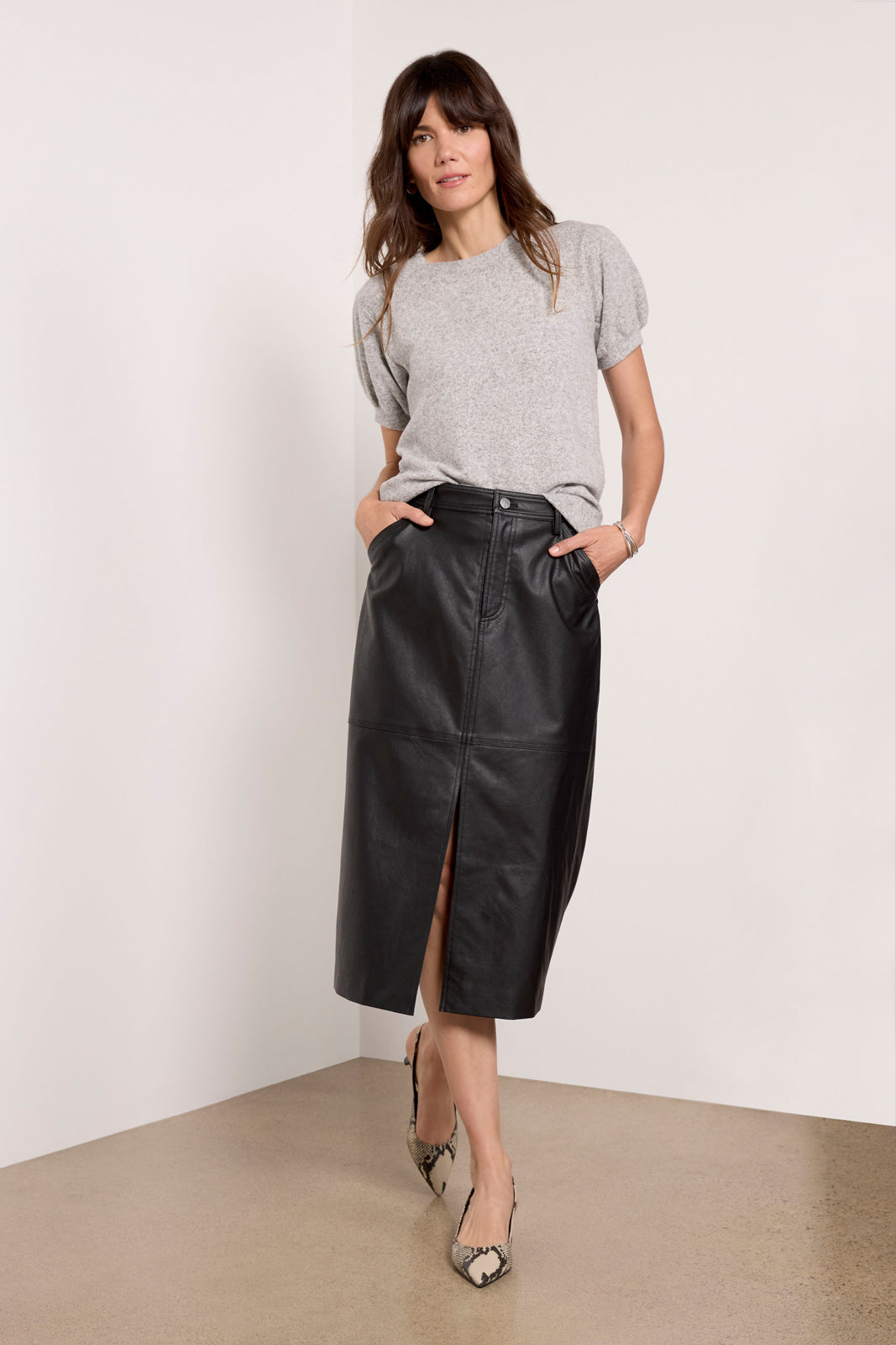 Finished in brushed knit fabric, this soft and stylish top by EVEREVE features a crewneck silhouette with a banded hem and short puff sleeves for a feminine feel. Style for fall with everything from bootcut jeans to a vegan leather midi skirt.