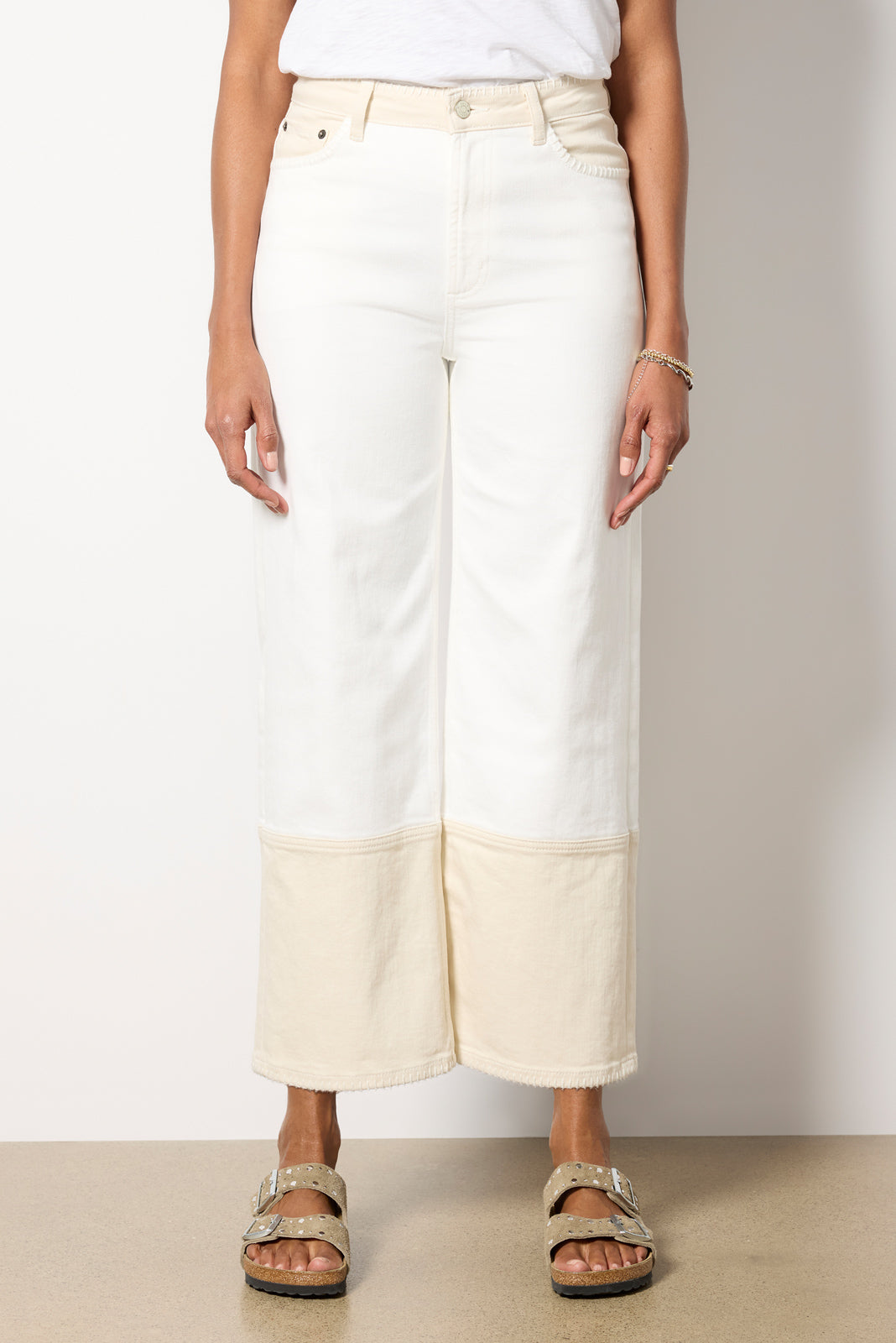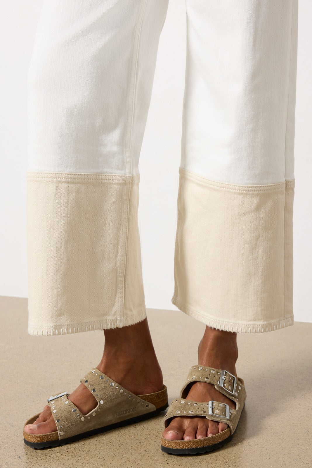 Embroidered trim and a two-tone design add interest to these chic wide leg jeans by Rails, featuring a flattering high-rise fit, light-stretch denim, and clean hems cropped at the ankle.
