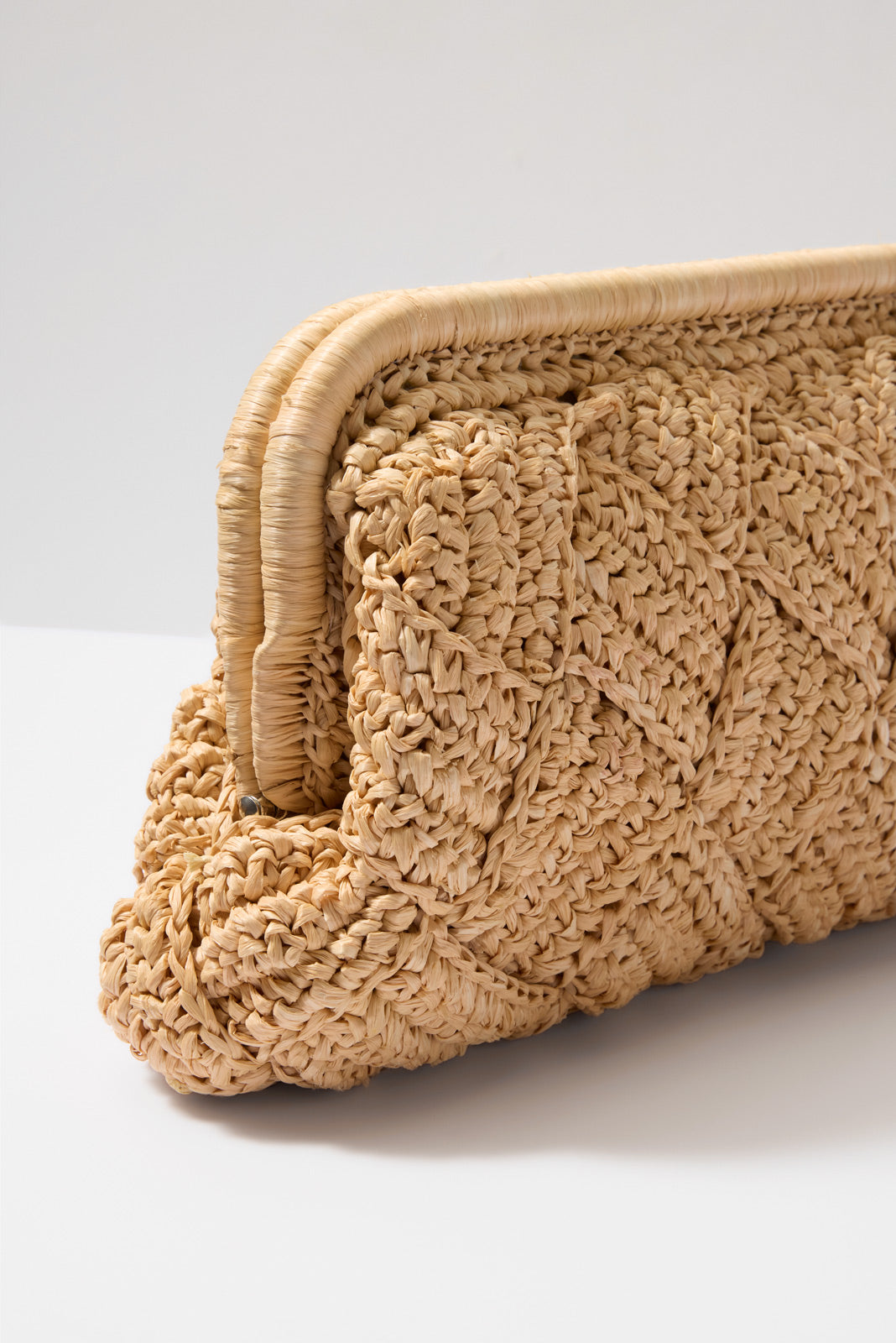 Give your look a touch of texture with this boho-inspired clutch by BTB, featuring a woven raffia exterior, framed top, and lined interior—perfect for carrying from day to night.