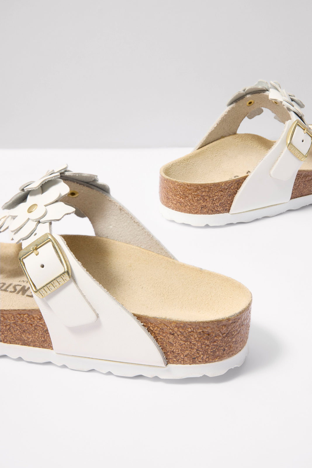 Appliqué flowers adorn these classic thong-style sandals by Birkenstock, featuring an adjustable leather strap and comfortable cork footbed.