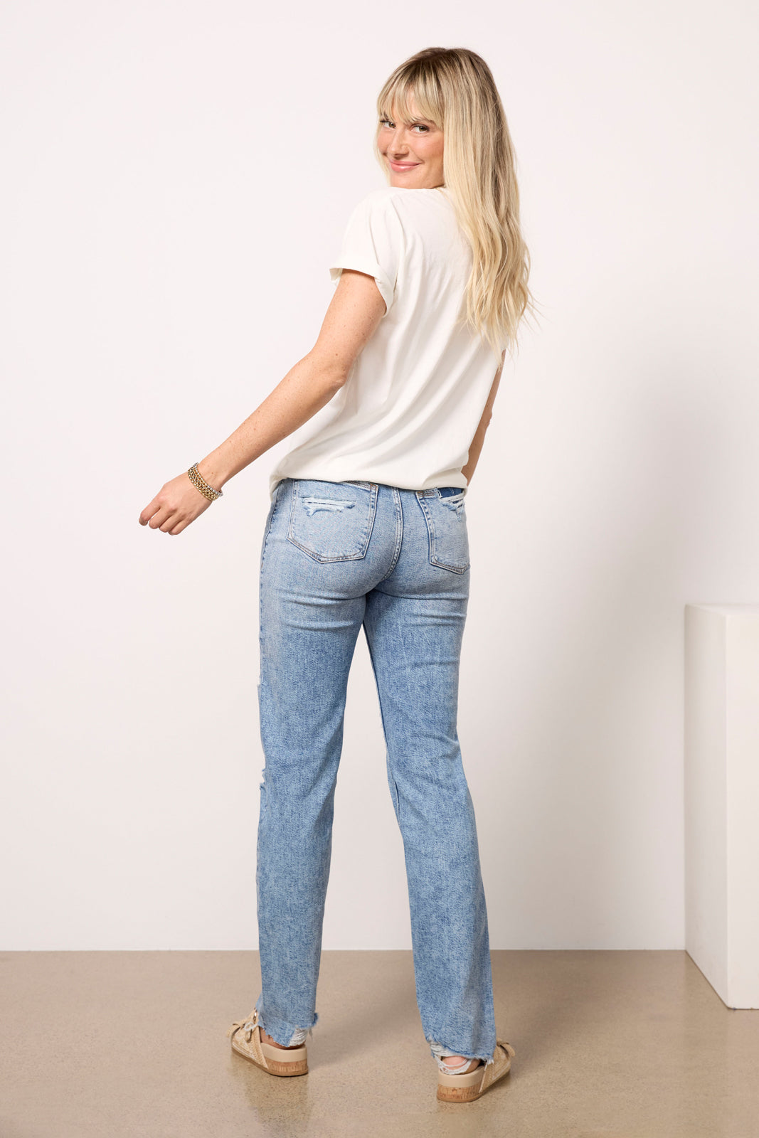 A vintage-inspired straight leg defines the Good Icon jean by Good American. Finished with distressed details and raw hems, these high-rise jeans are designed with a gap-proof waistband for an always-flattering fit.