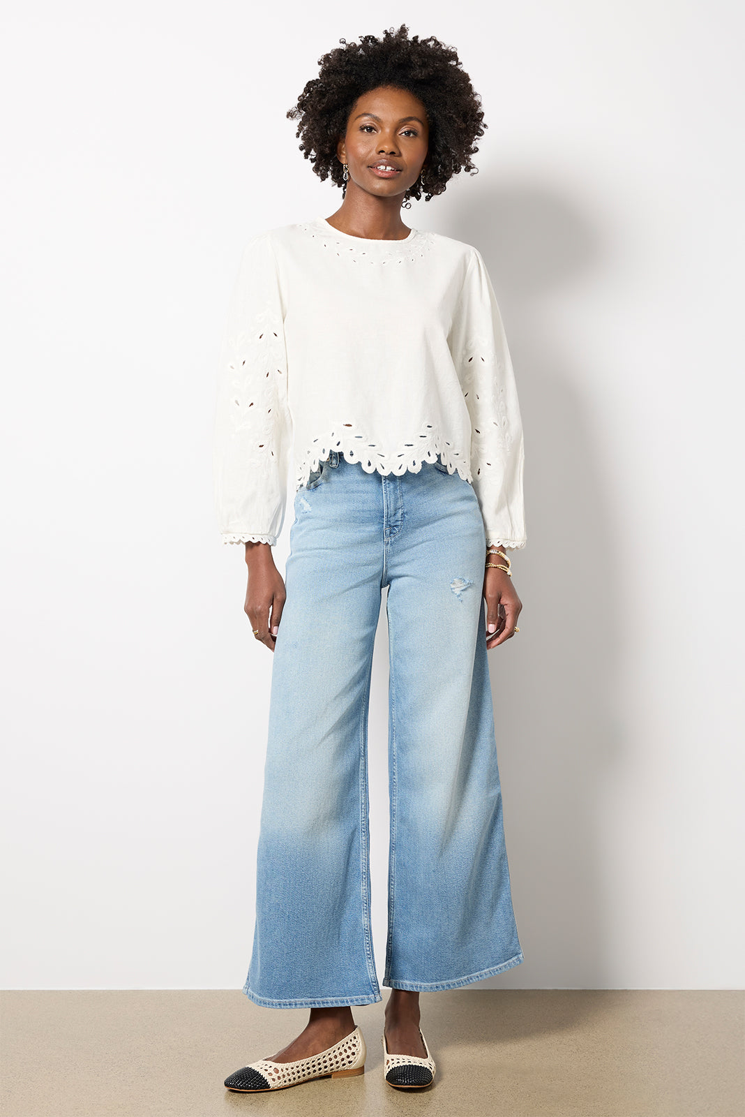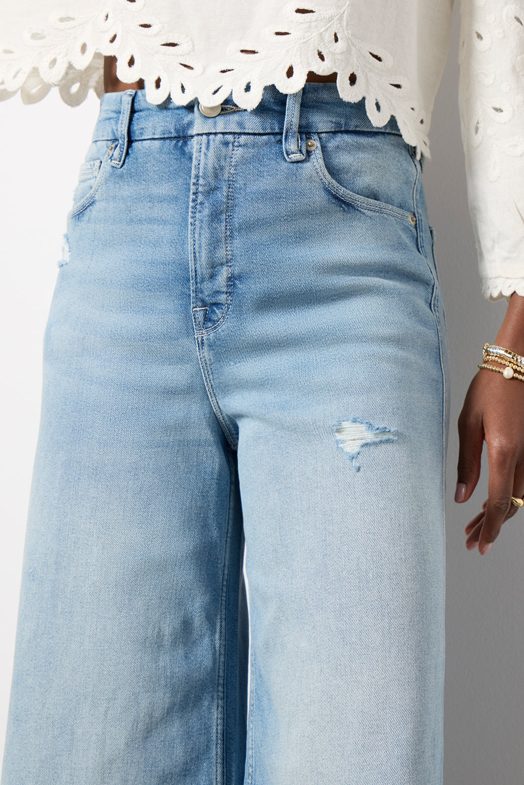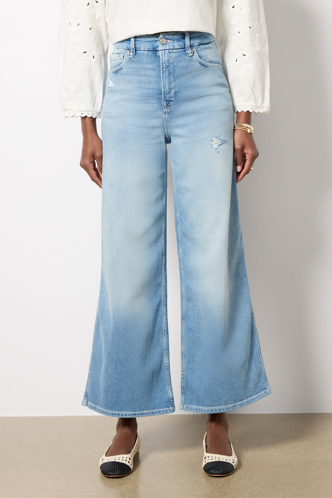 Crafted in a soft stretch denim, the Good Skate Crop features a high-rise fit, a light blue wash with subtle distressing, and a relaxed, wide-leg silhouette.
