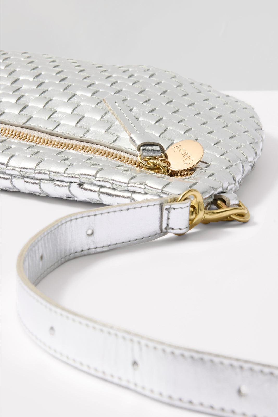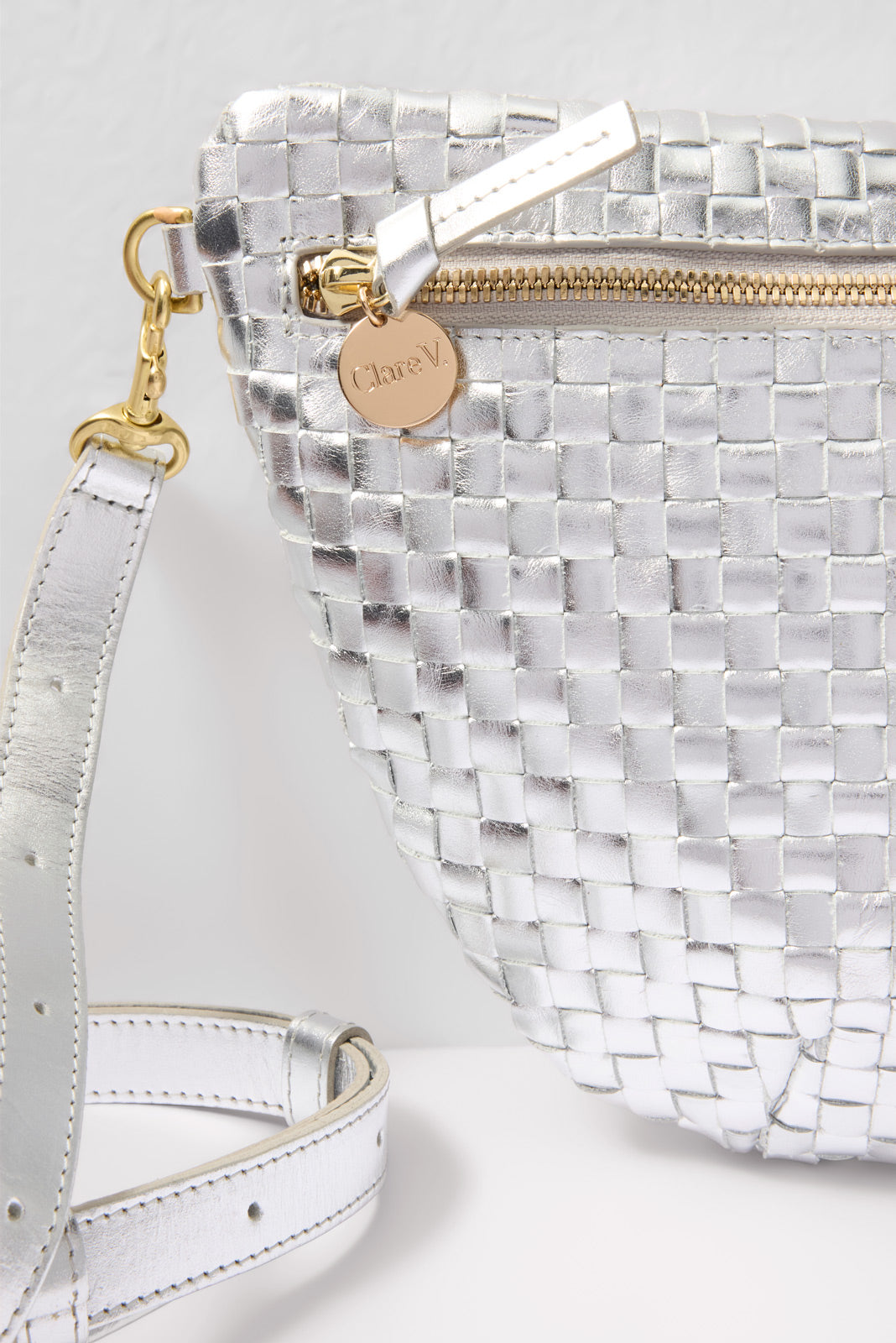 Chic and eye-catching, this metallic Clare V. bag is the perfect on-the-go essential. The Grande Fanny is crafted in woven silver leather with a chambray-lined interior and zipper closure. The detachable, adjustable strap can be worn at the waist, across the body, or on the shoulder.