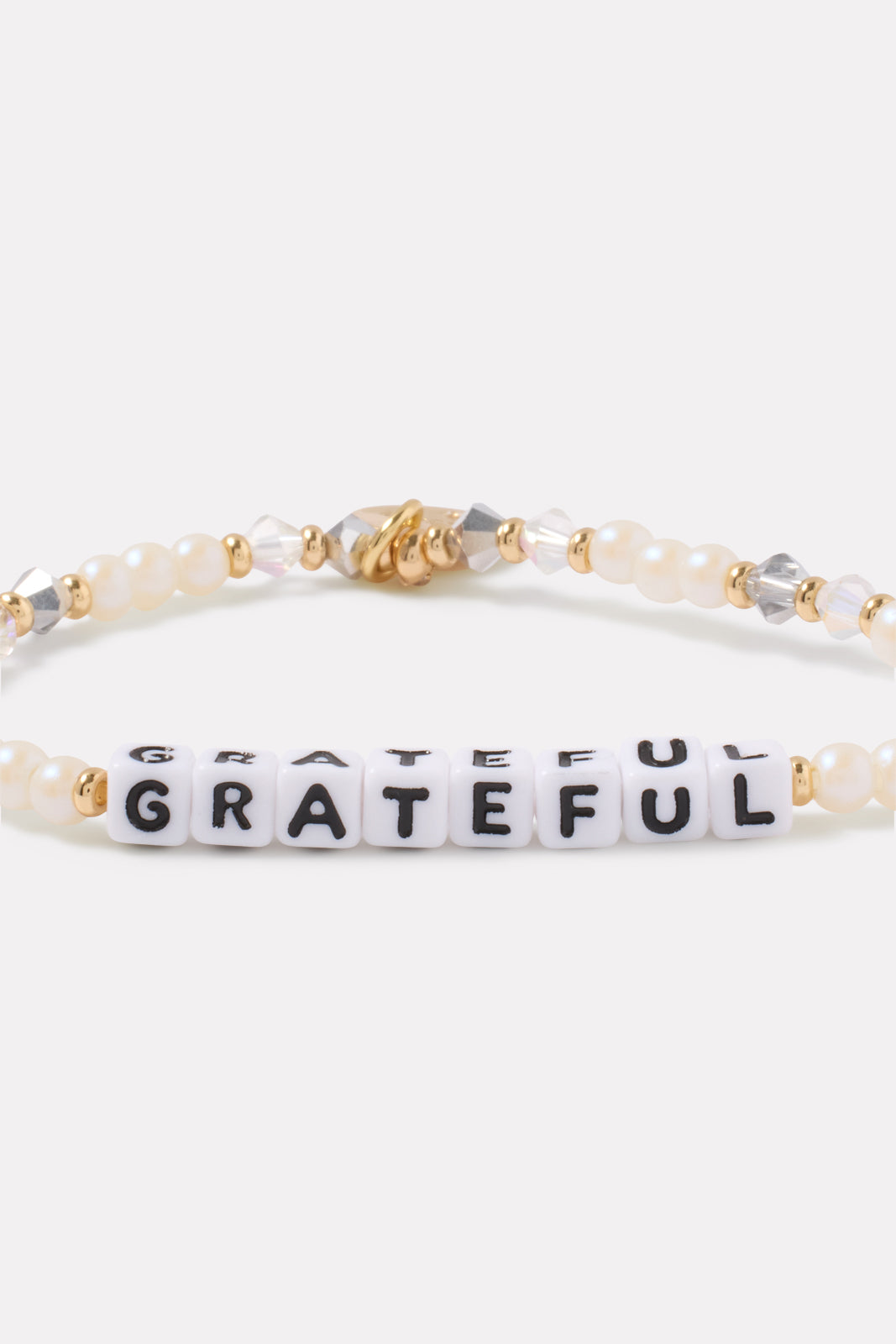 A wearable reminder of words to live by, this beaded bracelet by Little Words Project is handcrafted with “Grateful” lettering, faux pearl and crystal beads, and stretch elastic for easy on-and-off. Alone or stacked, it makes the perfect gift for yourself or a friend.