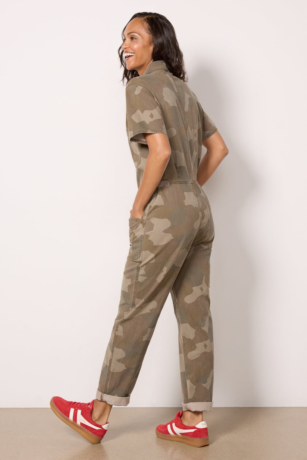 Utility-inspired style gets a chic update with this camo jumpsuit by Pistola. Finished with adjustable tabs at the waist for a customized fit, this short sleeve jumpsuit features a button-front bodice, patch pockets, and soft, non-stretch cotton fabric. Just add your favorite sneakers or slides.