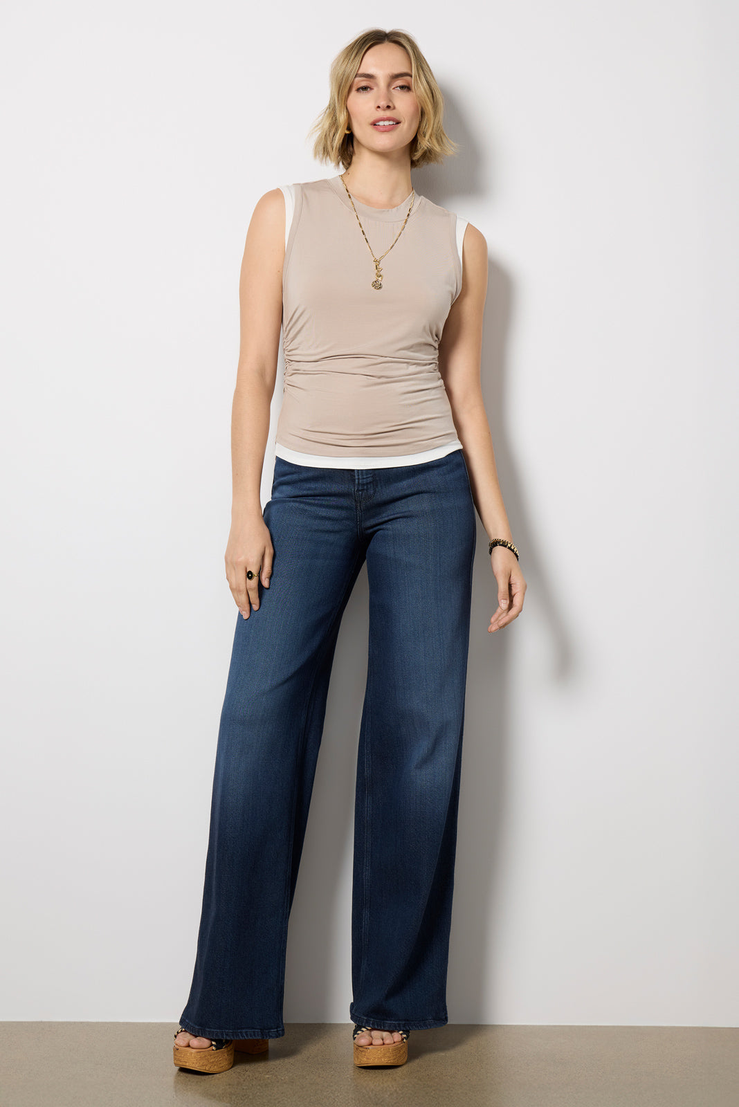 A two-in-one design creates the effortless layered look of the Hadley Twofer tank top by EVEREVE, finished in soft knit fabric with a crew neckline, ruching at the waist, and contrasting attached layers at the shoulders and hem.