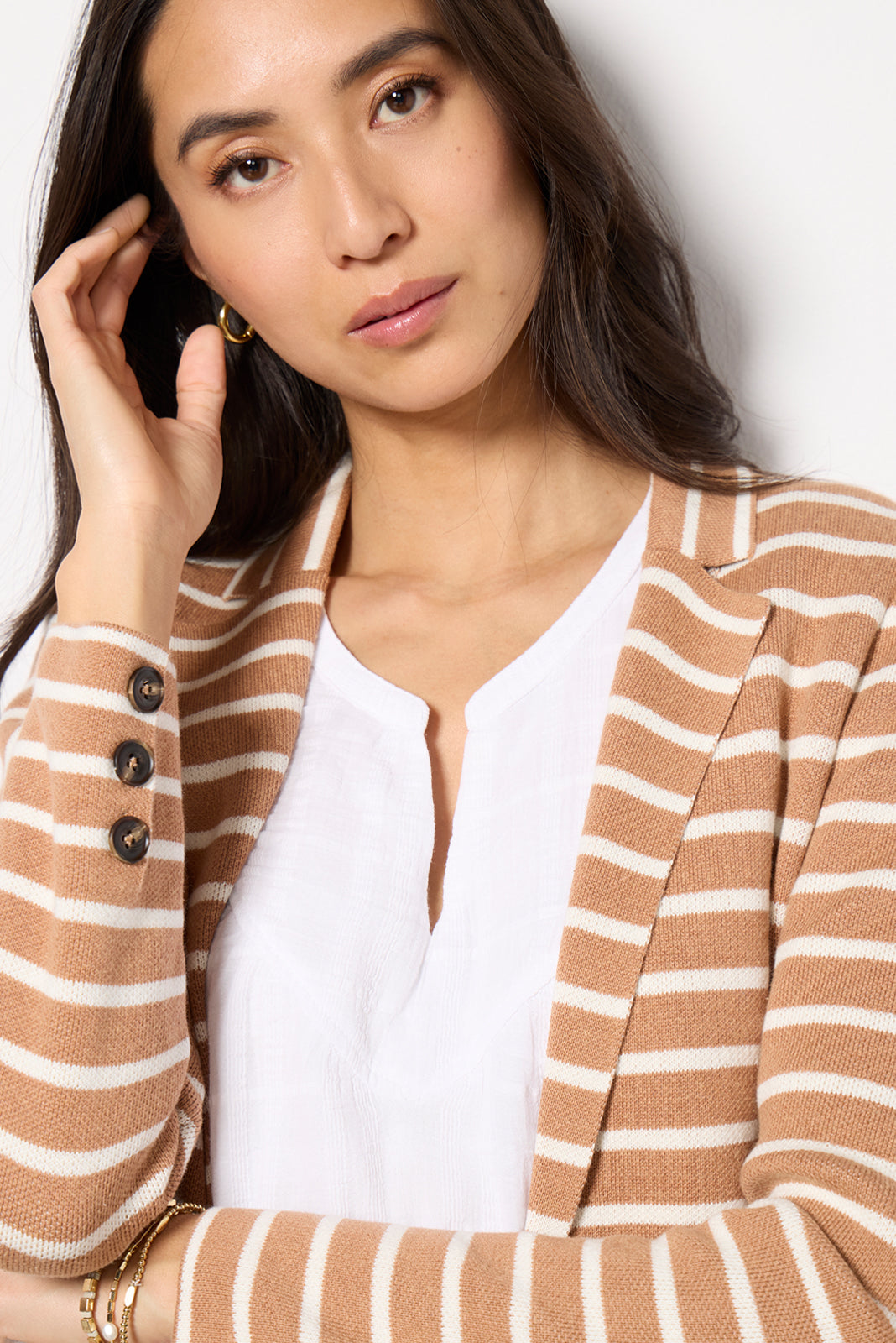 Add instant polish to your work-to-weekend wardrobe with the Hayes striped blazer by EVEREVE. Finished in a soft sweater knit, this chic layer features a front button closure, notched collar, and long sleeves with button cuffs.