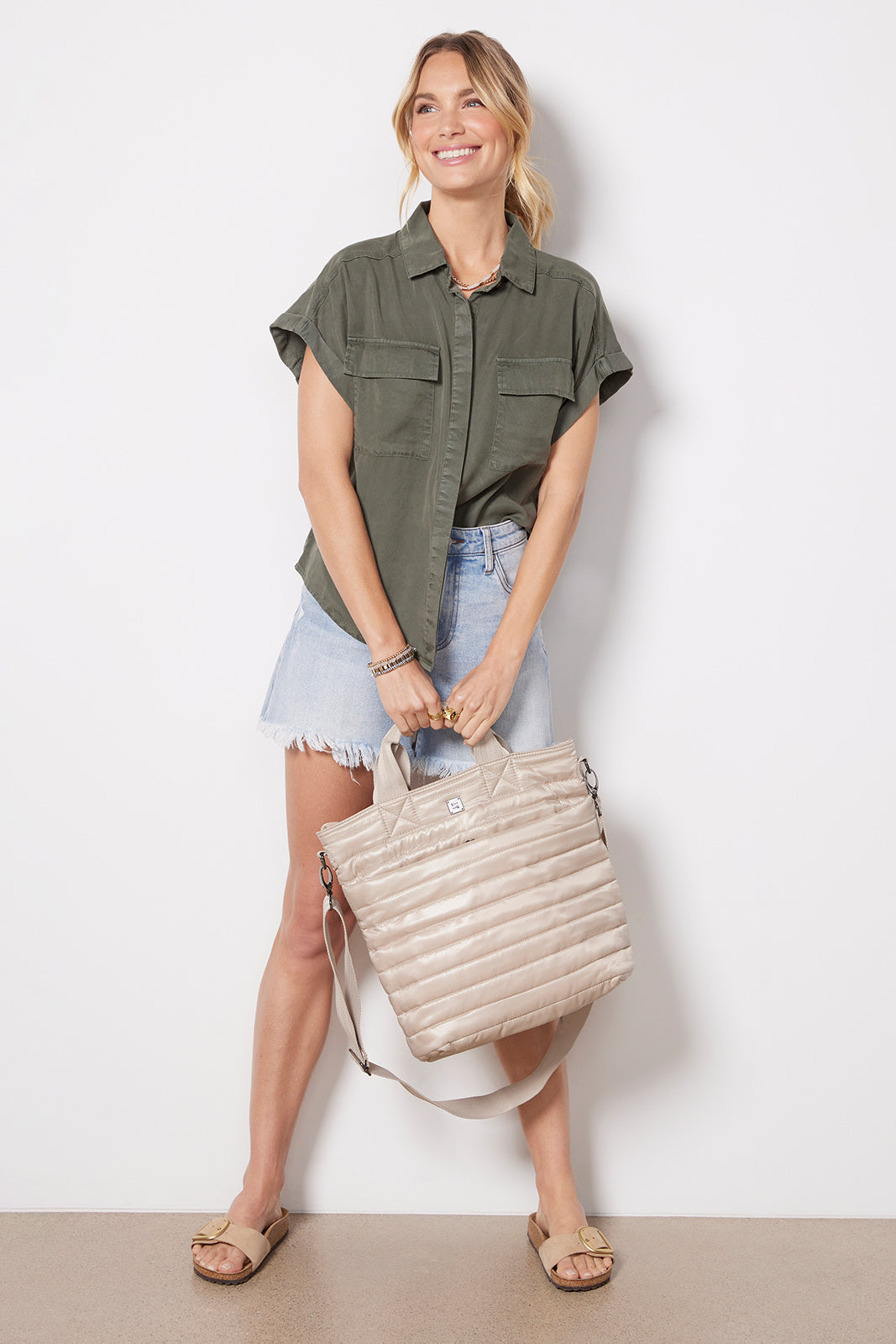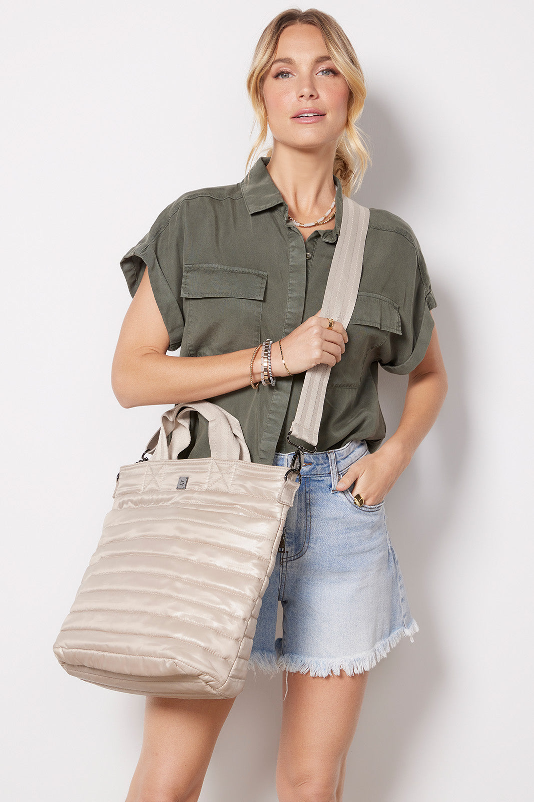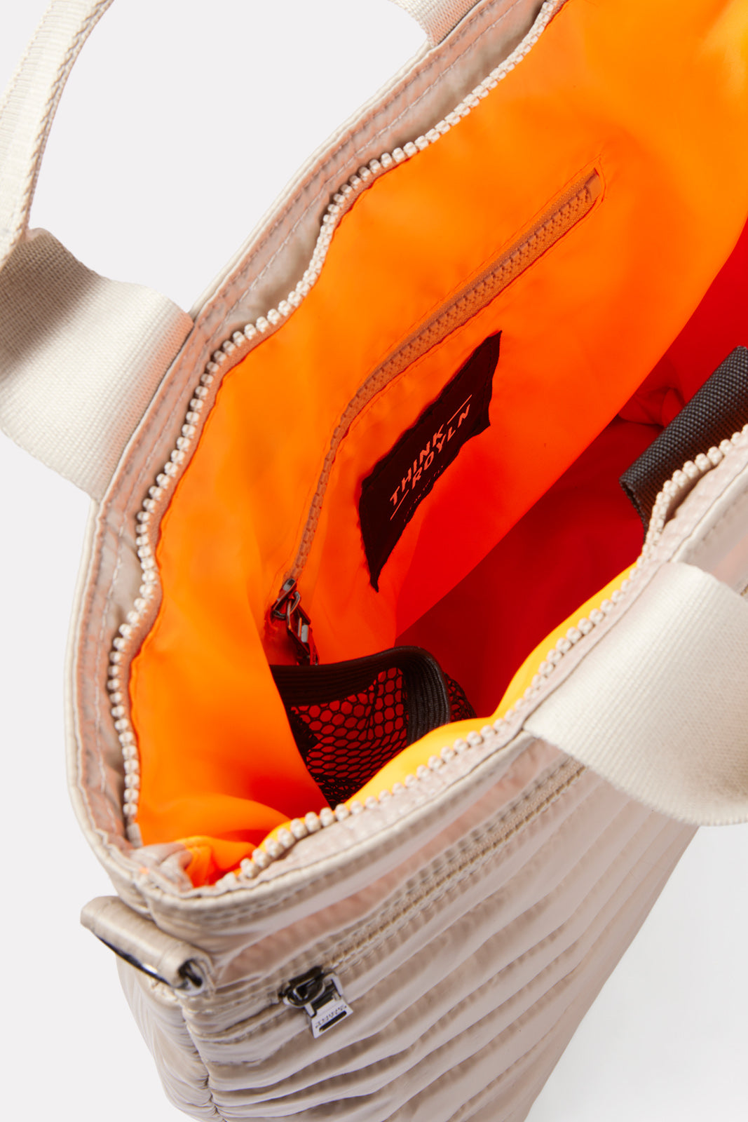 Carry your work-to-weekend essentials in this stylish Think Royln bag. The sleek, quilted exterior features a front slip pocket and a back zipper pocket, while the vibrant interior features a zipper compartment and mesh water bottle pocket. Go hands-free with the detachable, adjustable crossbody strap.