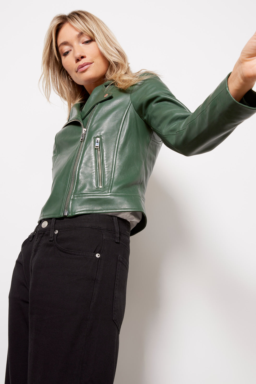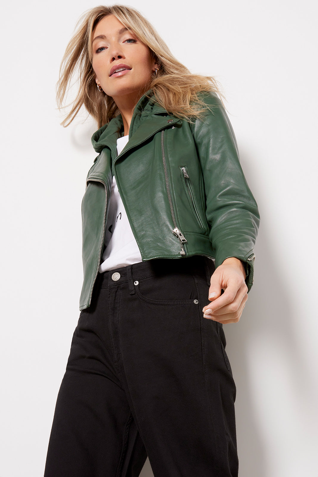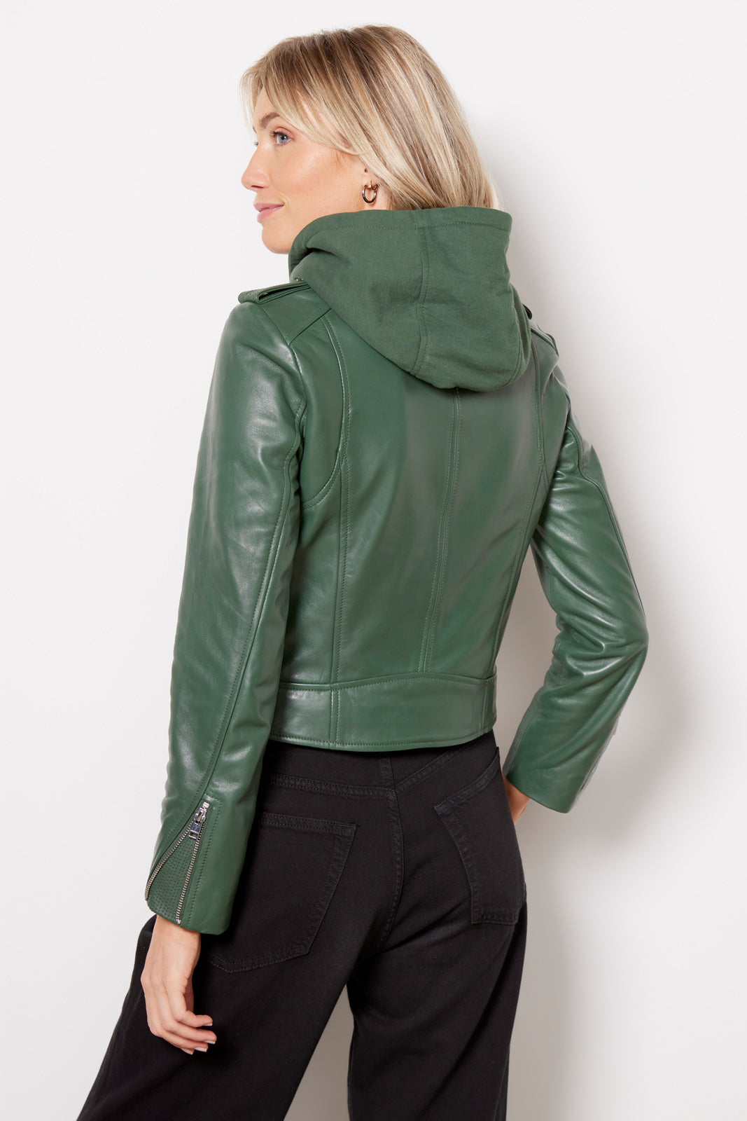 Edgy meets chic with this versatile moto jacket by Lamarque. Topped with a removable hood, this stylish biker jacket is crafted in soft green leather with an asymmetrical front closure and zippers at the pockets and cuffs. Layer with a midi dress or a tee and jeans.