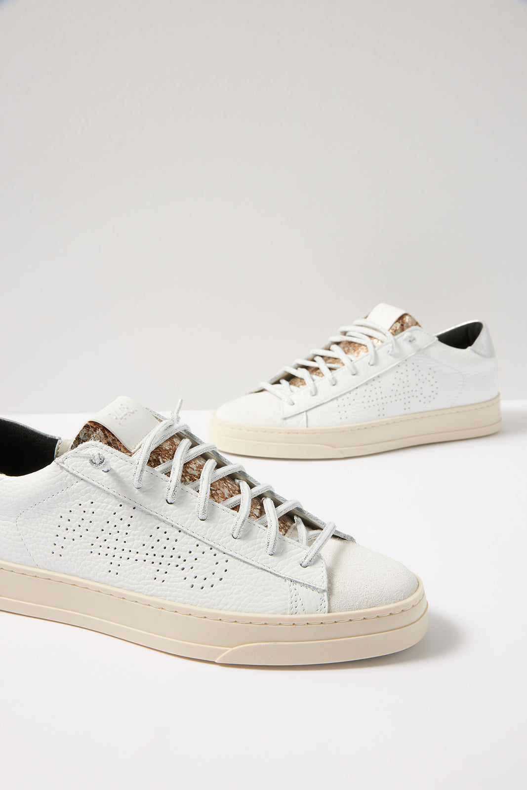 A crackled bronze tongue adds an eye-catching touch to these low-top sneakers by P448, crafted in white pebbled leather with a silver heel tab and perforated logo detail.
