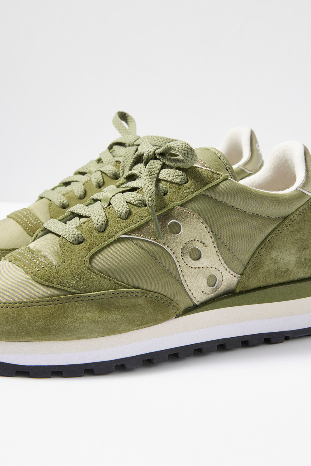 Reto-inspired with an earthy green color palette, these low-top sneakers by Saucony are perfect for your weekend rotation, featuring a stacked midsole and a soft suede upper with metallic accents.
